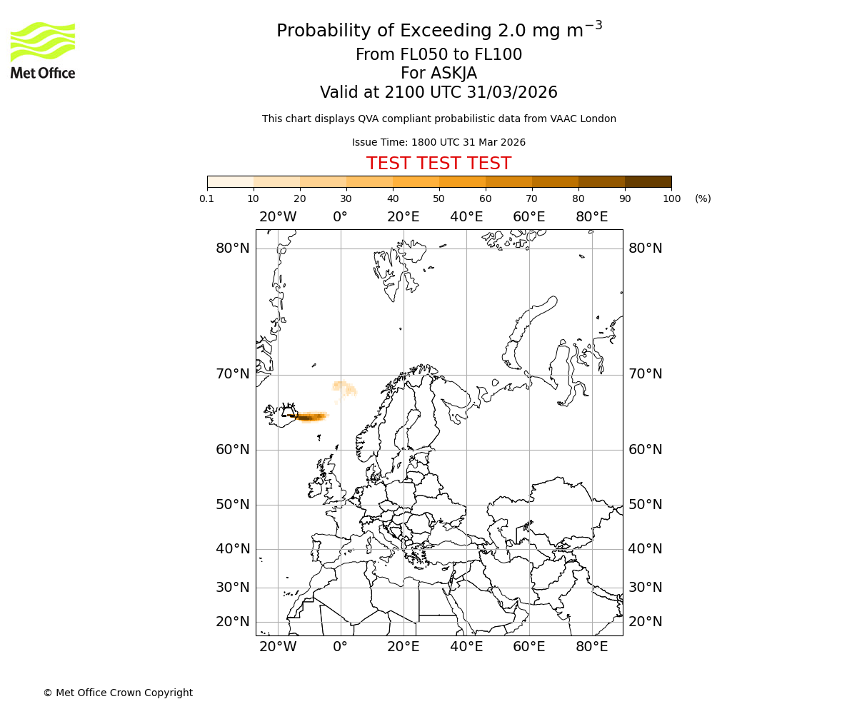 Probability of exceeding 2.0 milligrams per metre cubed. From 000 to 050 for ASKJA. Valid at 2100 UTC 31/03/2026