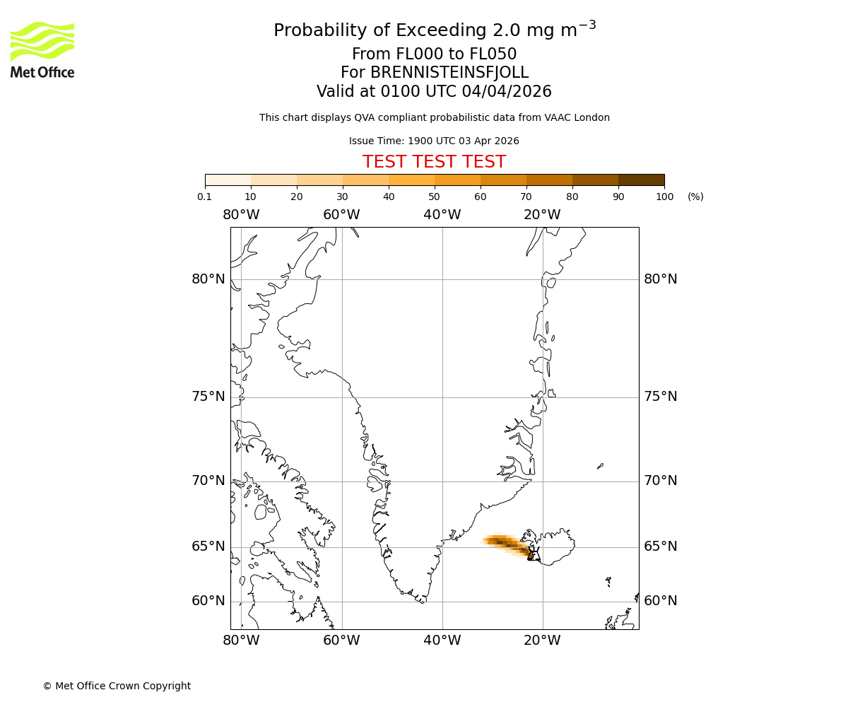 Quantitative Volcanic Ash charts (QVA) are produced in accordance with International Civil Aviation Organization (ICAO) Annex 3 requirements and are provided as well as the London Volcanic Ash Advisory Graphics (VAG) and Advisories (VAA). The lowest QVA threshold (0.2 mg/m³) matches to the areas depicted in the VAA and VAG. Both expected ash concentration and probabilistic forecast information is provided in the chart viewer below for eruptions occurring in the London Volcanic Ash Advisory Centre (VAAC) area of responsibility.