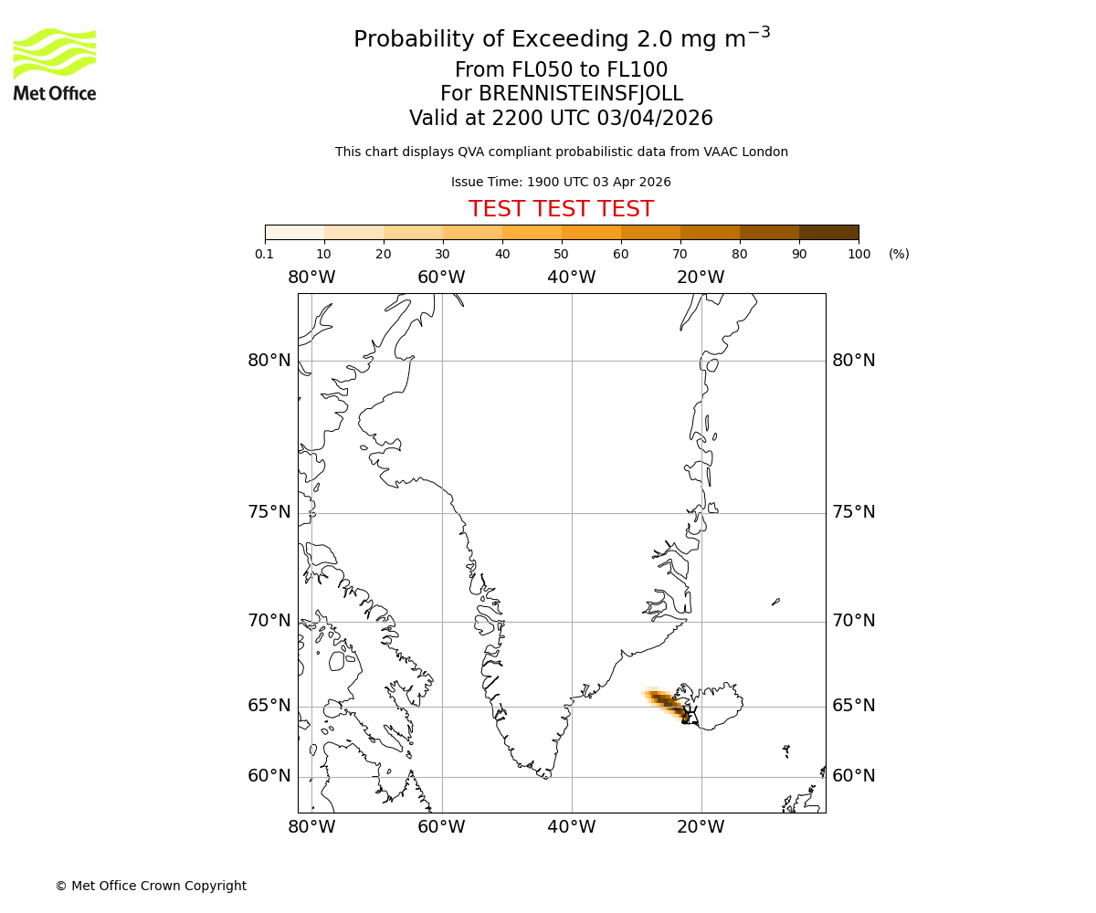 Probability of exceeding 2.0 milligrams per metre cubed. From 000 to 050 for BRENNISTEINSFJOLL. Valid at 2200 UTC 03/04/2026