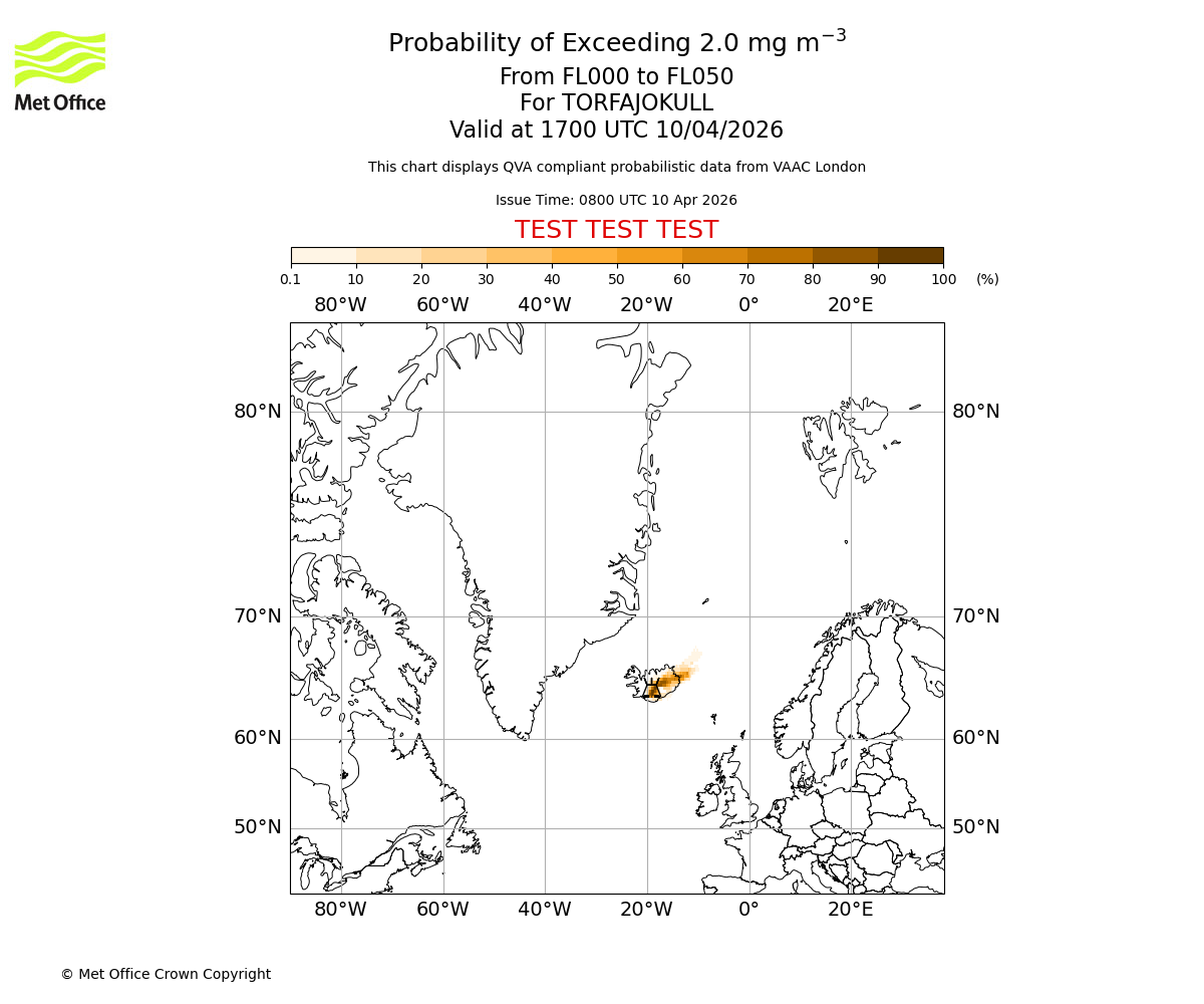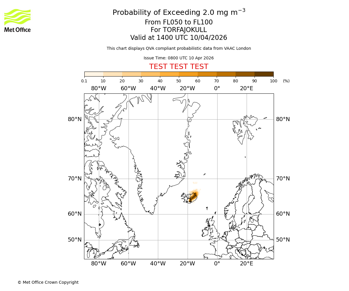 Probability of exceeding 2.0 milligrams per metre cubed. From 000 to 050 for TORFAJOKULL. Valid at 1400 UTC 10/04/2026