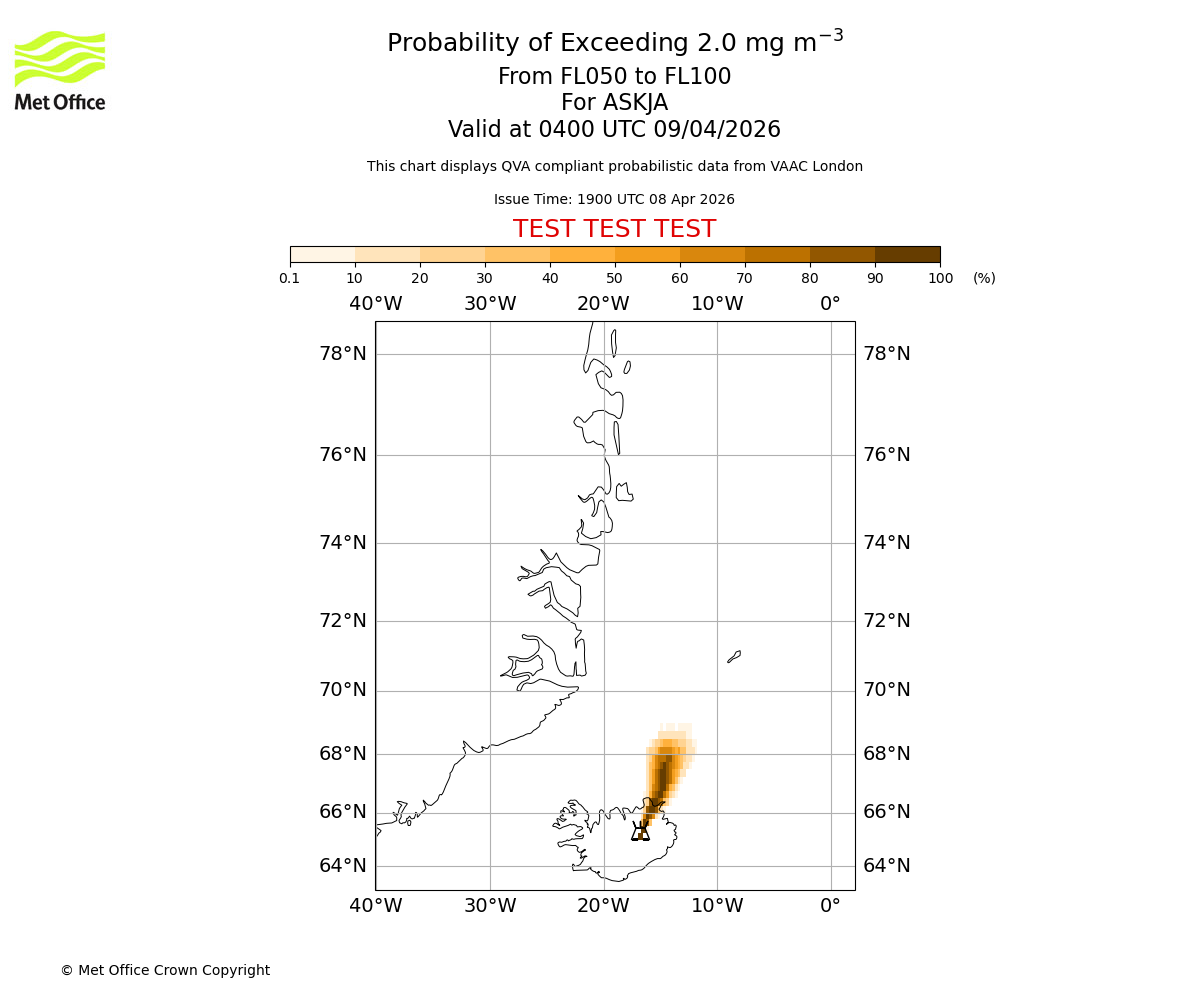 Probability of exceeding 2.0 milligrams per metre cubed. From 000 to 050 for ASKJA. Valid at 0400 UTC 09/04/2026