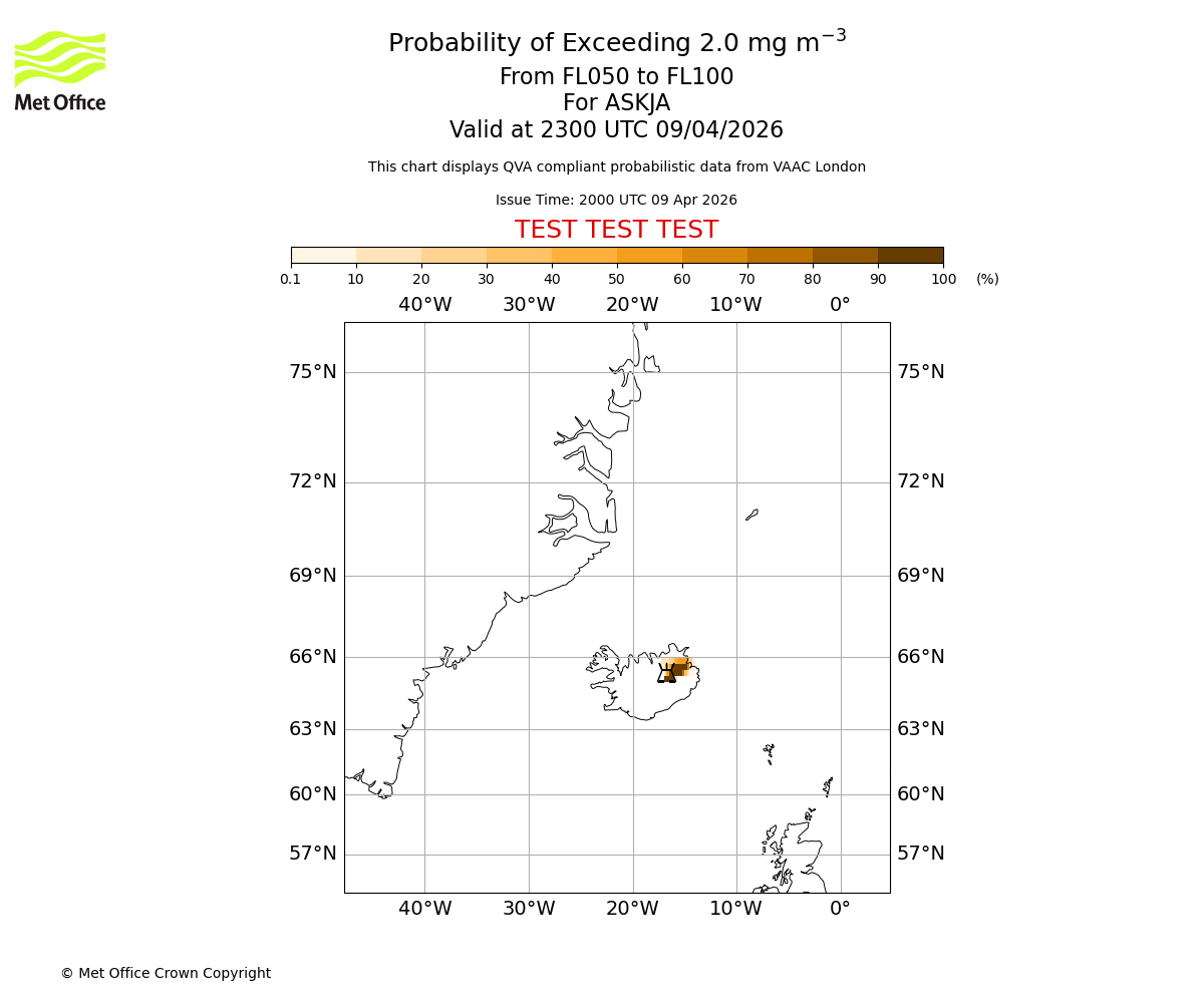 Probability of exceeding 2.0 milligrams per metre cubed. From 000 to 050 for ASKJA. Valid at 2300 UTC 09/04/2026