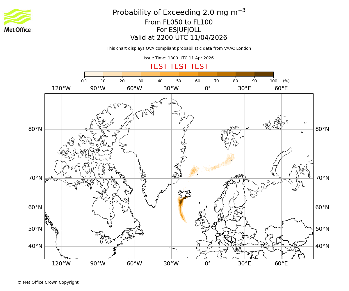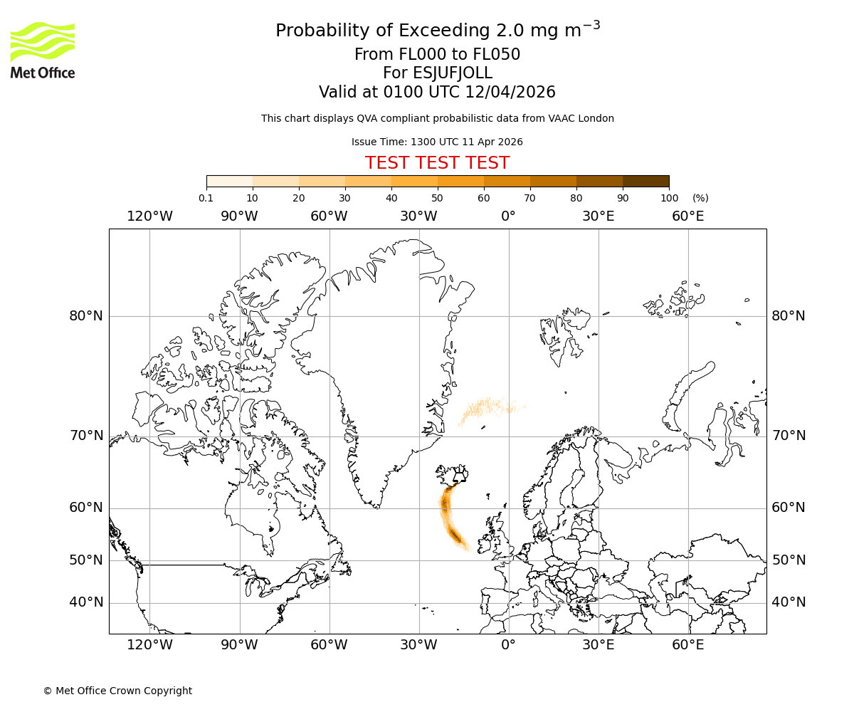 Quantitative Volcanic Ash charts (QVA) are produced in accordance with International Civil Aviation Organization (ICAO) Annex 3 requirements and are provided as well as the London Volcanic Ash Advisory Graphics (VAG) and Advisories (VAA). The lowest QVA threshold (0.2 mg/m³) matches to the areas depicted in the VAA and VAG. Both expected ash concentration and probabilistic forecast information is provided in the chart viewer below for eruptions occurring in the London Volcanic Ash Advisory Centre (VAAC) area of responsibility.