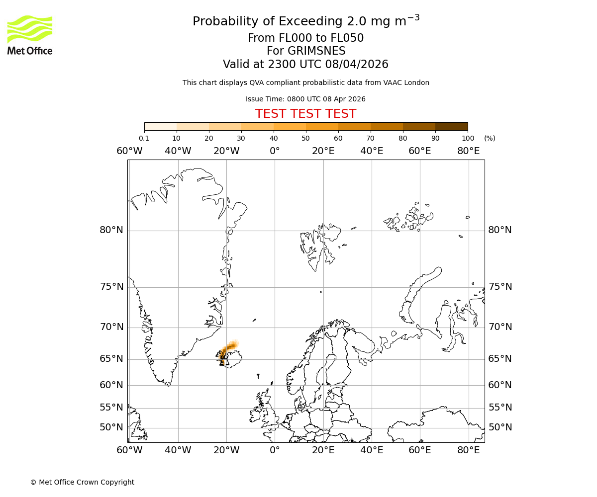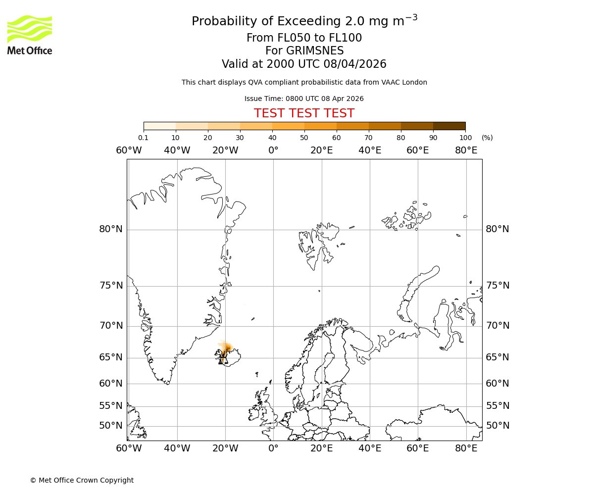 Quantitative Volcanic Ash charts (QVA) are produced in accordance with International Civil Aviation Organization (ICAO) Annex 3 requirements and are provided as well as the London Volcanic Ash Advisory Graphics (VAG) and Advisories (VAA). The lowest QVA threshold (0.2 mg/m³) matches to the areas depicted in the VAA and VAG. Both expected ash concentration and probabilistic forecast information is provided in the chart viewer below for eruptions occurring in the London Volcanic Ash Advisory Centre (VAAC) area of responsibility.