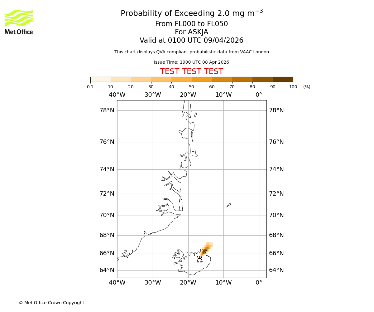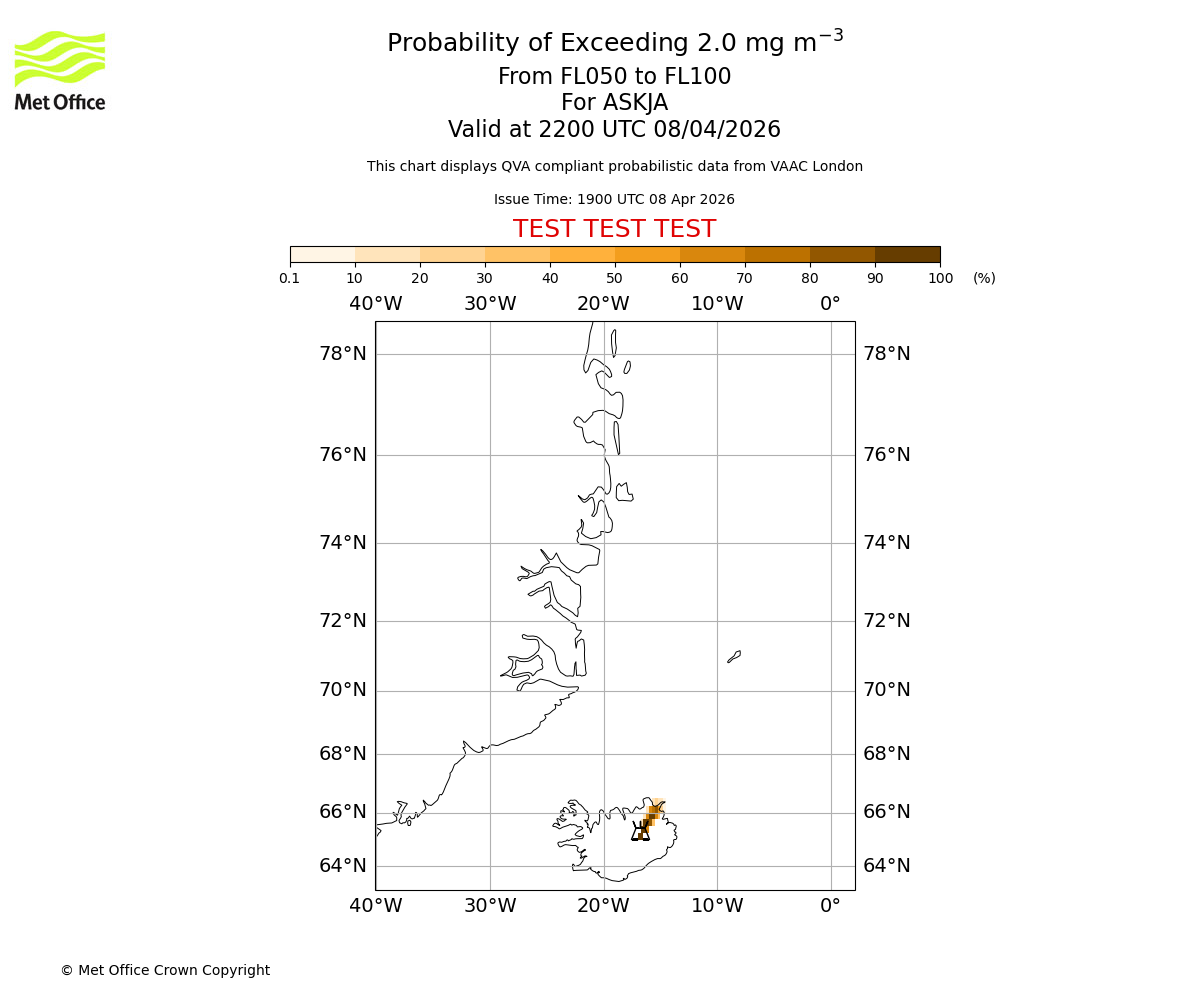 Probability of exceeding 2.0 milligrams per metre cubed. From 000 to 050 for ASKJA. Valid at 2200 UTC 08/04/2026