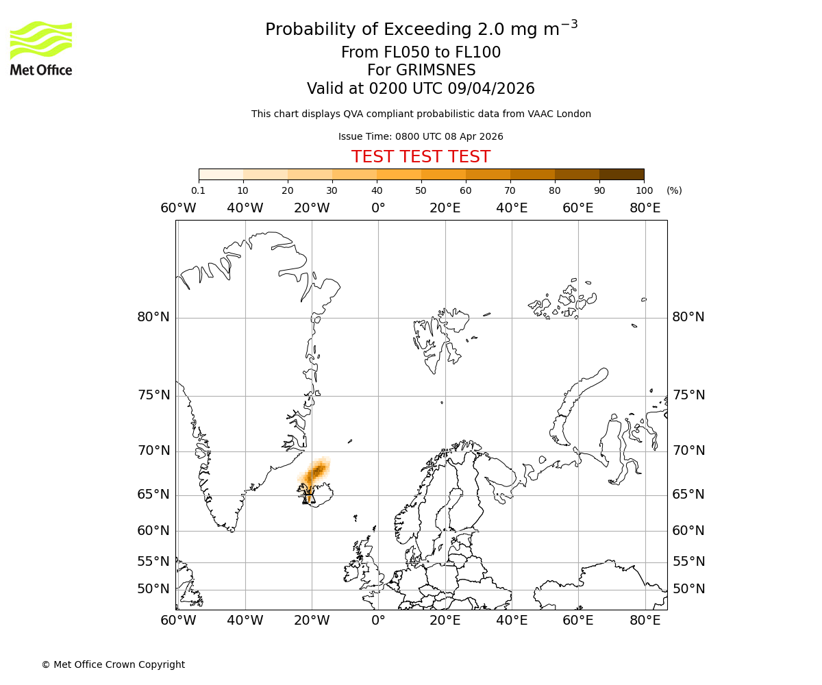 Probability of exceeding 2.0 milligrams per metre cubed. From 000 to 050 for GRIMSNES. Valid at 0200 UTC 09/04/2026