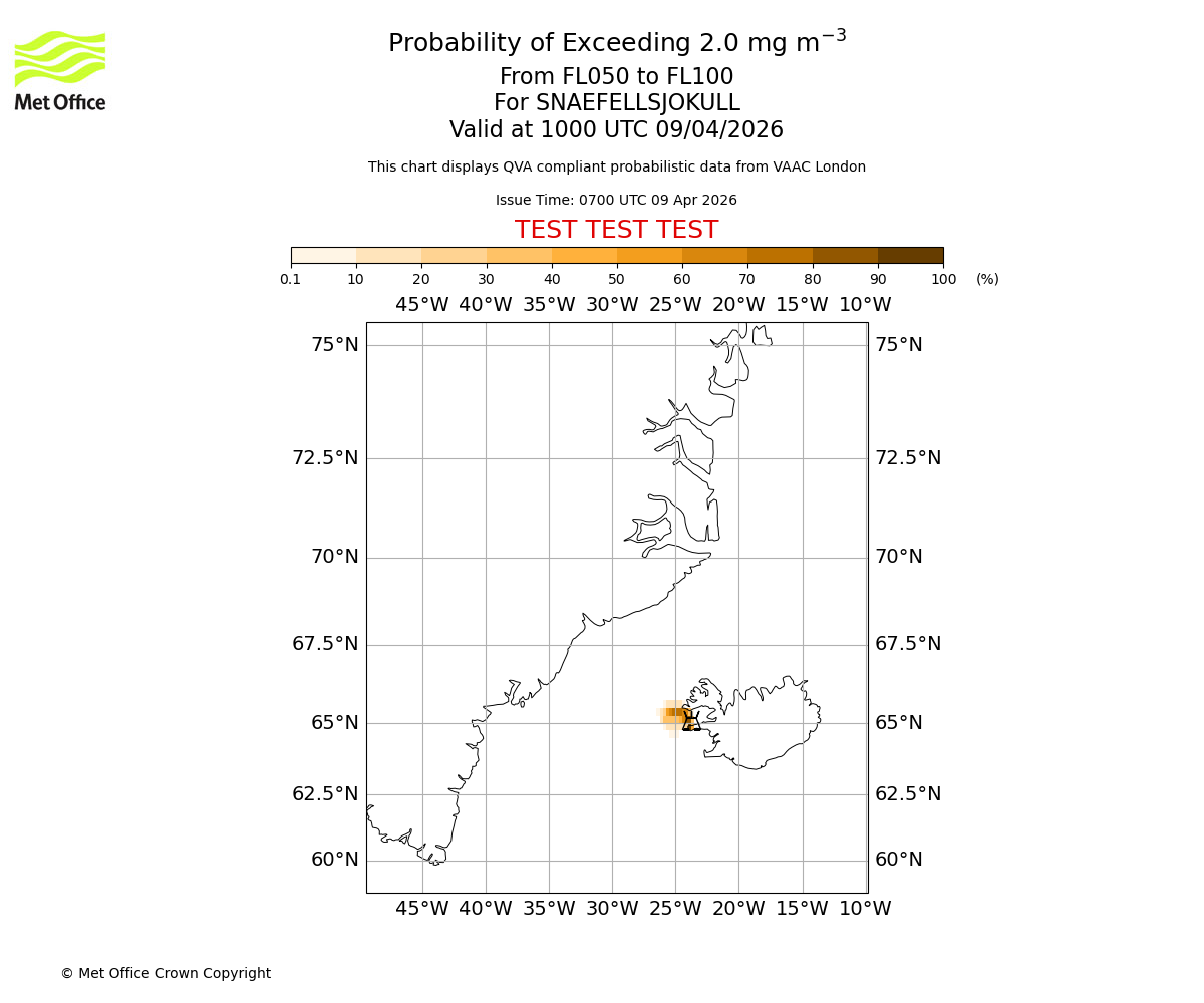 Probability of exceeding 2.0 milligrams per metre cubed. From 000 to 050 for SNAEFELLSJOKULL. Valid at 1000 UTC 09/04/2026