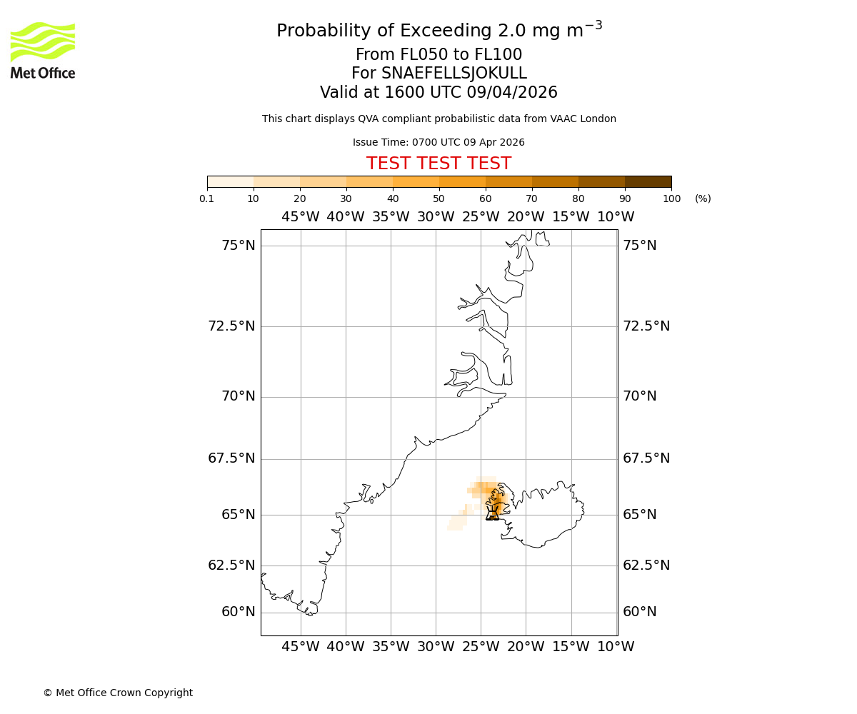 Probability of exceeding 2.0 milligrams per metre cubed. From 000 to 050 for SNAEFELLSJOKULL. Valid at 1600 UTC 09/04/2026