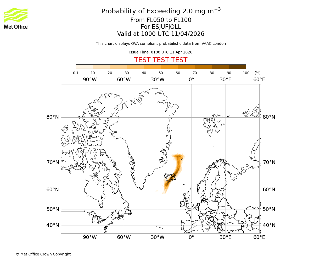 Modelled ash concentration from 000 to 050 for ESJUFJOLL. Valid at 0100 UTC 11/04/2026