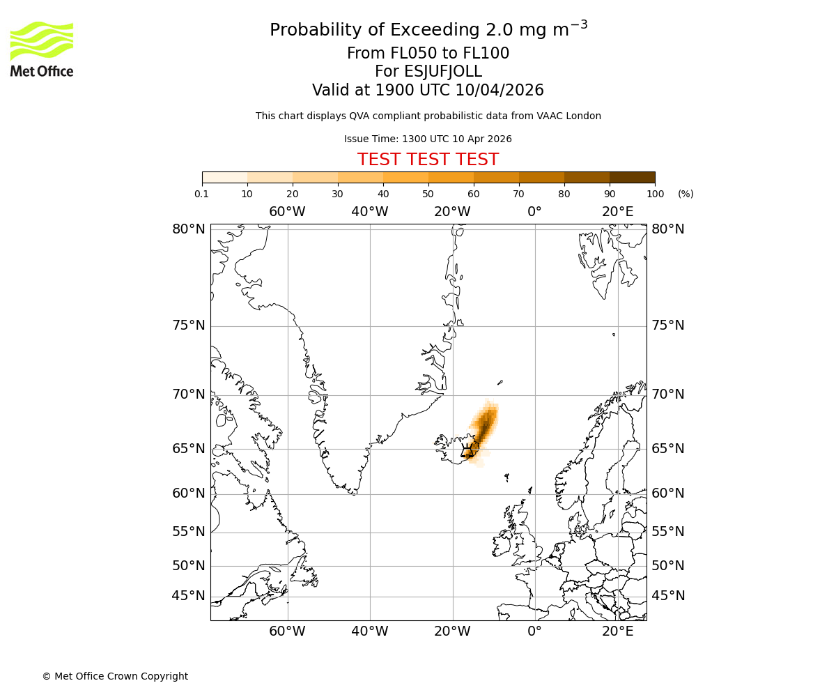 Quantitative Volcanic Ash charts (QVA) are produced in accordance with International Civil Aviation Organization (ICAO) Annex 3 requirements and are provided as well as the London Volcanic Ash Advisory Graphics (VAG) and Advisories (VAA). The lowest QVA threshold (0.2 mg/m³) matches to the areas depicted in the VAA and VAG. Both expected ash concentration and probabilistic forecast information is provided in the chart viewer below for eruptions occurring in the London Volcanic Ash Advisory Centre (VAAC) area of responsibility.