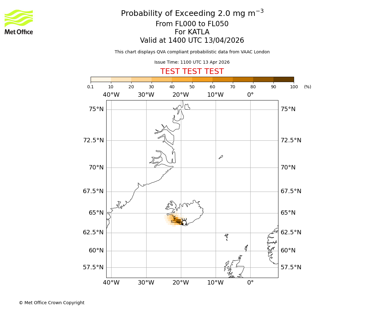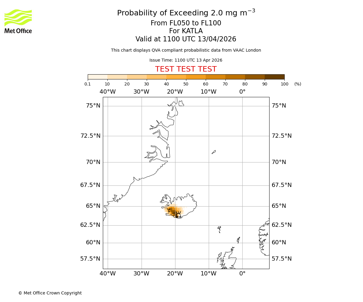 Probability of exceeding 2.0 milligrams per metre cubed. From 000 to 050 for KATLA. Valid at 1100 UTC 13/04/2026