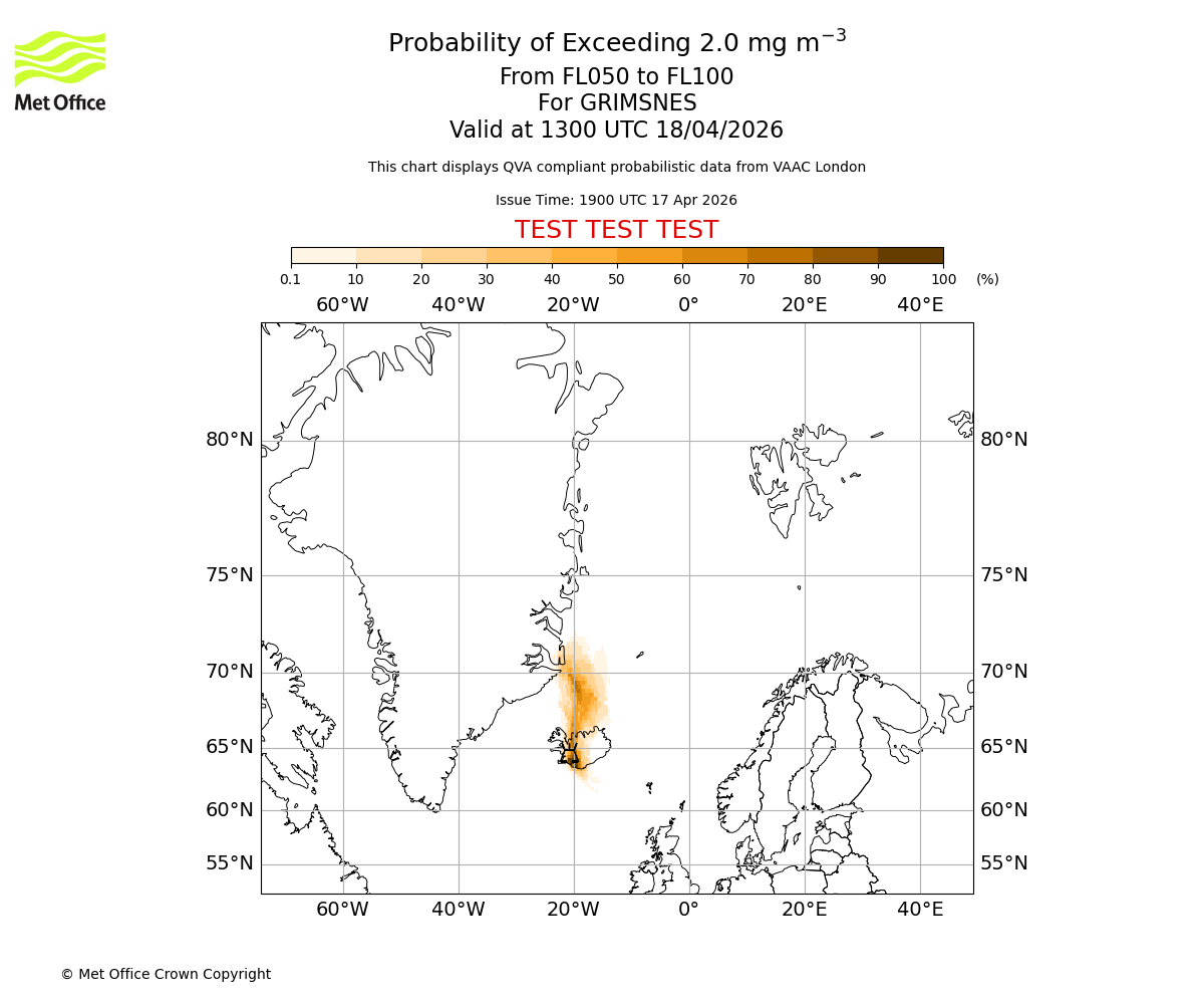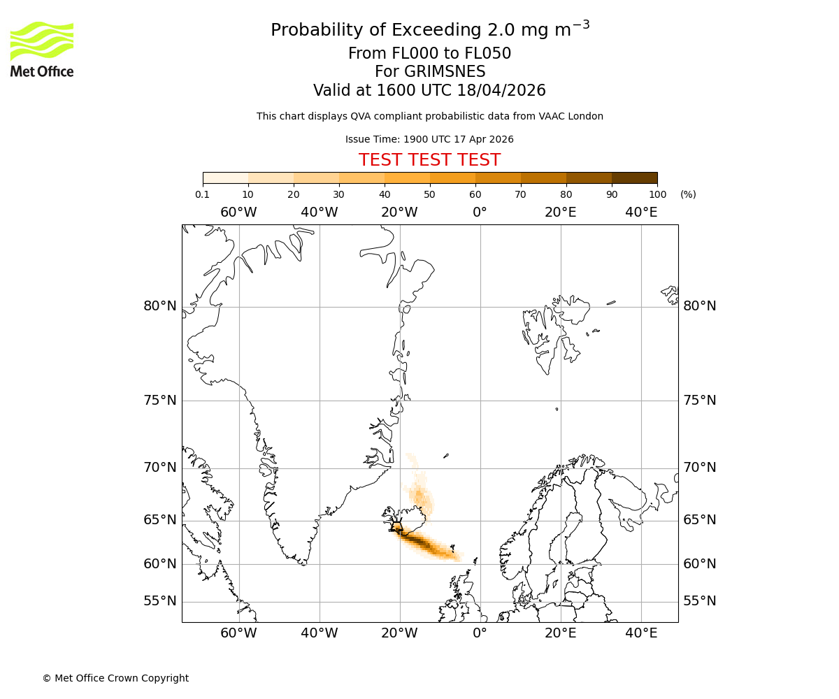 Quantitative Volcanic Ash charts (QVA) are produced in accordance with International Civil Aviation Organization (ICAO) Annex 3 requirements and are provided as well as the London Volcanic Ash Advisory Graphics (VAG) and Advisories (VAA). The lowest QVA threshold (0.2 mg/m³) matches to the areas depicted in the VAA and VAG. Both expected ash concentration and probabilistic forecast information is provided in the chart viewer below for eruptions occurring in the London Volcanic Ash Advisory Centre (VAAC) area of responsibility.