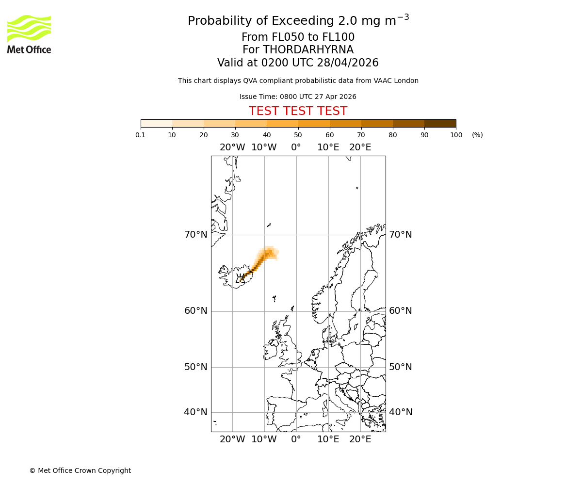 Probability of exceeding 2.0 milligrams per metre cubed. From 000 to 050 for THORDARHYRNA. Valid at 0200 UTC 28/04/2026