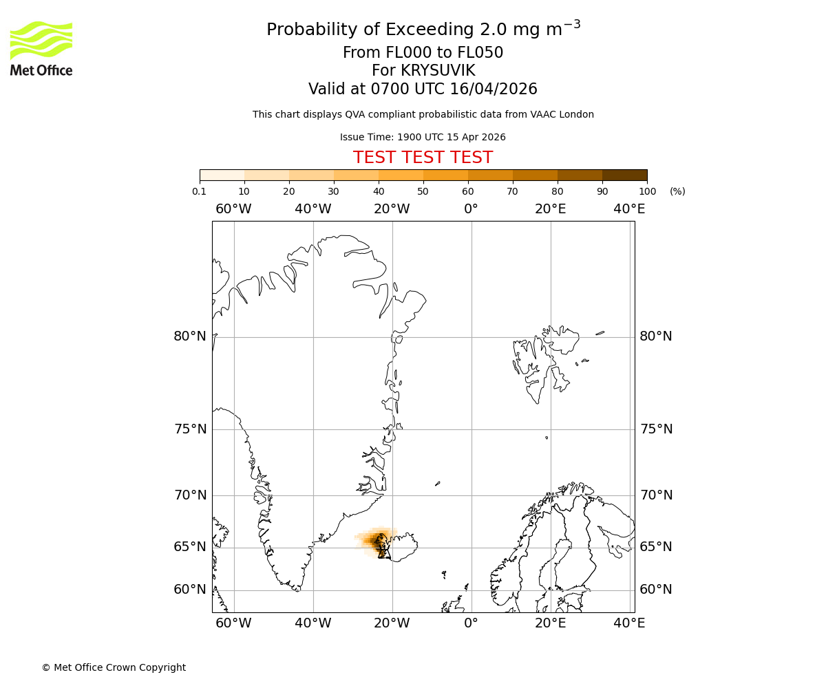 Quantitative Volcanic Ash charts (QVA) are produced in accordance with International Civil Aviation Organization (ICAO) Annex 3 requirements and are provided as well as the London Volcanic Ash Advisory Graphics (VAG) and Advisories (VAA). The lowest QVA threshold (0.2 mg/m³) matches to the areas depicted in the VAA and VAG. Both expected ash concentration and probabilistic forecast information is provided in the chart viewer below for eruptions occurring in the London Volcanic Ash Advisory Centre (VAAC) area of responsibility.