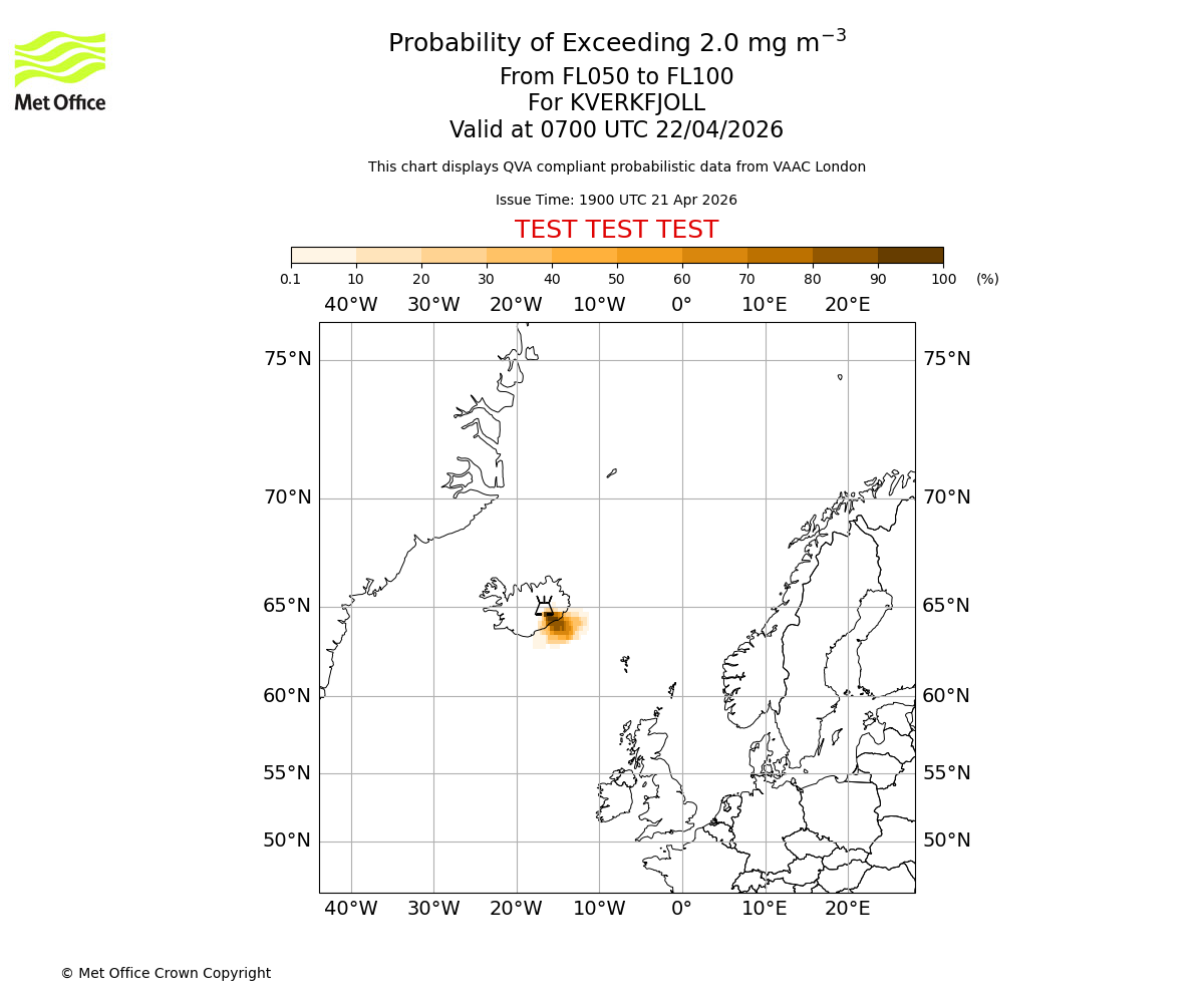 Probability of exceeding 2.0 milligrams per metre cubed. From 000 to 050 for KVERKFJOLL. Valid at 0700 UTC 22/04/2026