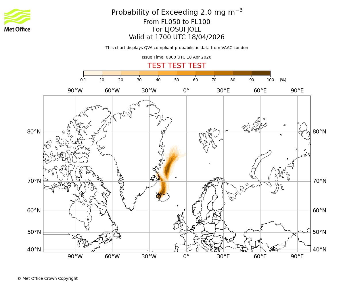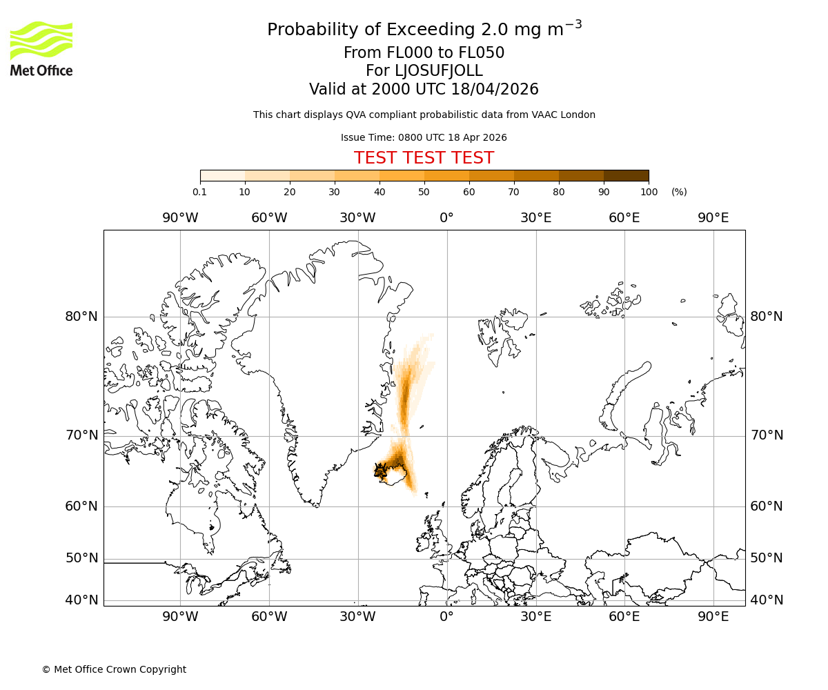 Modelled ash concentration from 000 to 050 for LJOSUFJOLL. Valid at 0800 UTC 18/04/2026