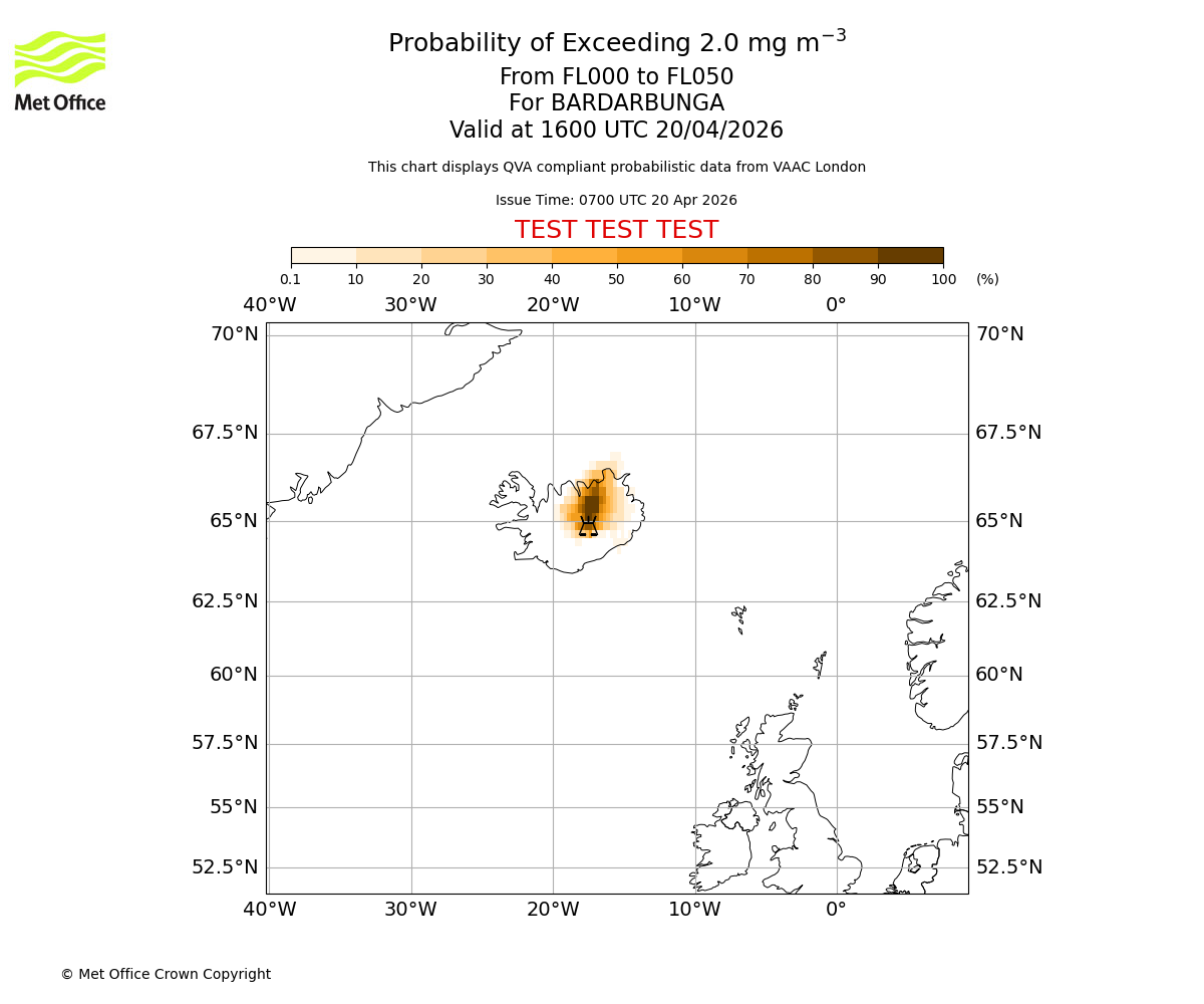 Modelled ash concentration from 000 to 200 for BARDARBUNGA. Valid at 0700 UTC 20/04/2026