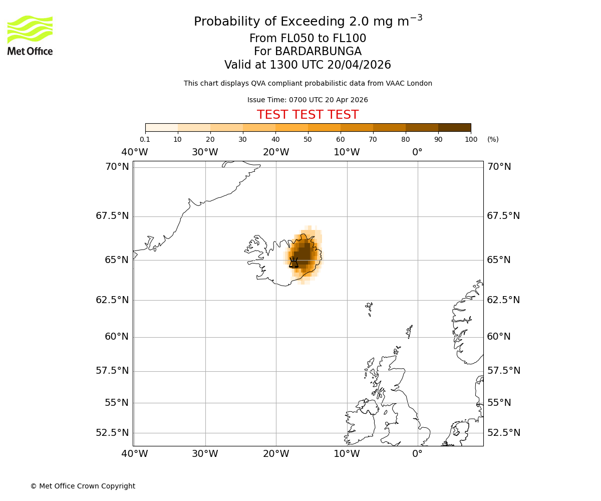 Probability of exceeding 2.0 milligrams per metre cubed. From 000 to 050 for BARDARBUNGA. Valid at 1300 UTC 20/04/2026