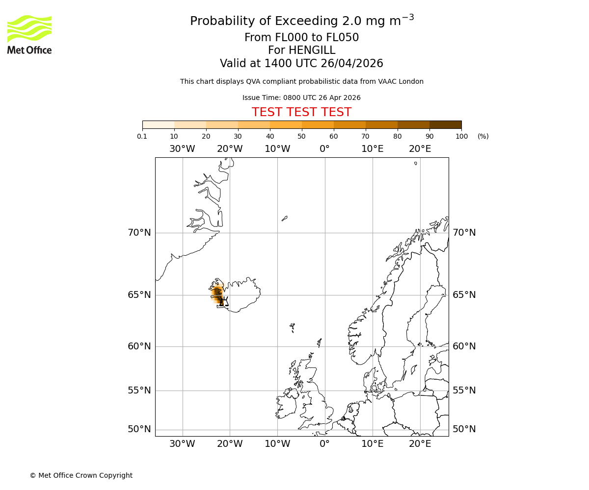 Modelled ash concentration from 000 to 050 for HENGILL. Valid at 0800 UTC 26/04/2026