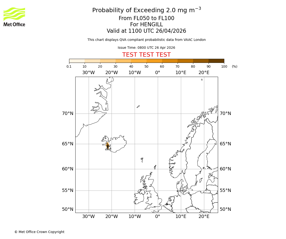 Probability of exceeding 2.0 milligrams per metre cubed. From 000 to 050 for HENGILL. Valid at 1100 UTC 26/04/2026