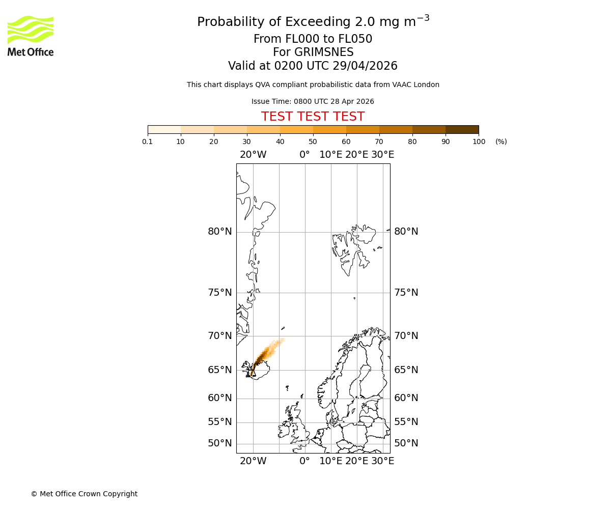 Probability of exceeding 2.0 milligrams per metre cubed. From 000 to 050 for GRIMSNES. Valid at 2300 UTC 28/04/2026