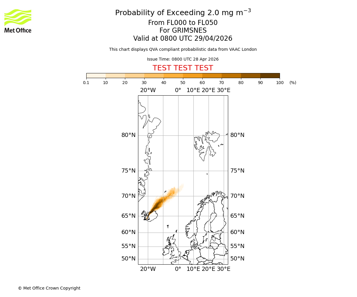 Probability of exceeding 2.0 milligrams per metre cubed. From 000 to 050 for GRIMSNES. Valid at 0500 UTC 29/04/2026