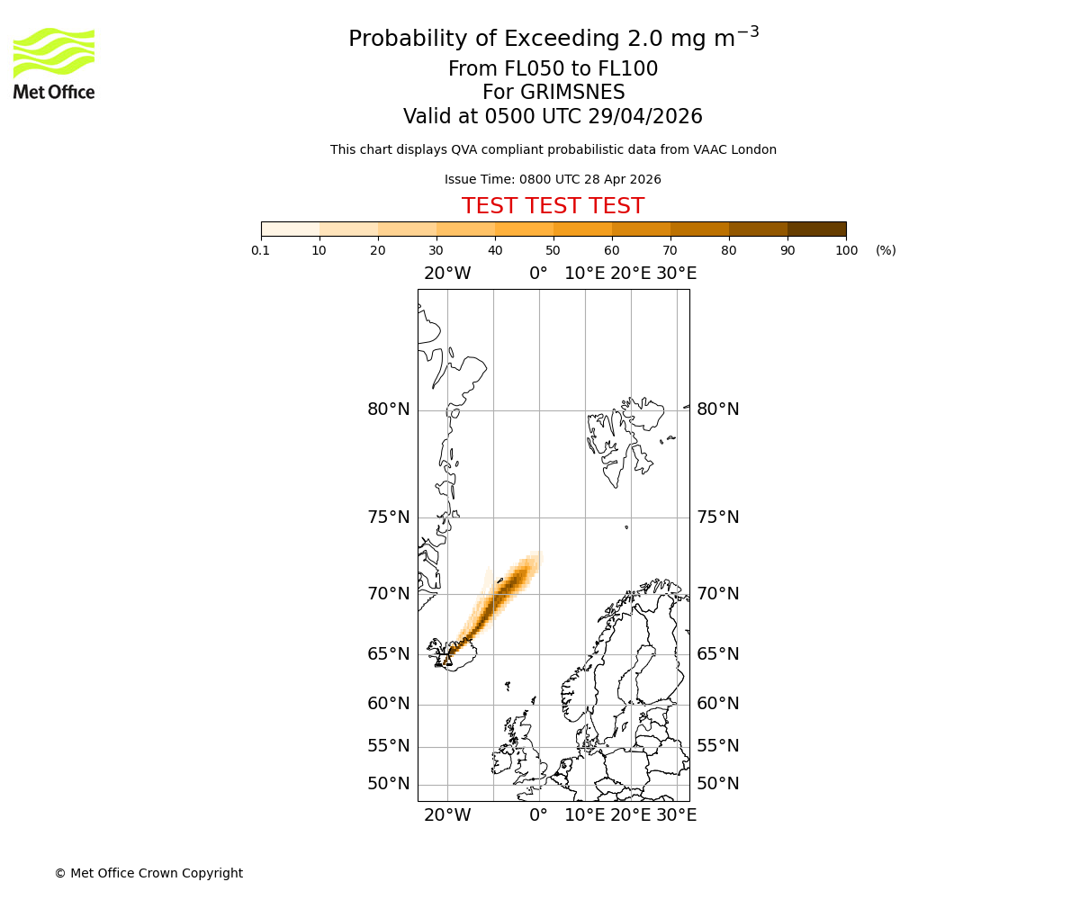 Quantitative Volcanic Ash charts (QVA) are produced in accordance with International Civil Aviation Organization (ICAO) Annex 3 requirements and are provided as well as the London Volcanic Ash Advisory Graphics (VAG) and Advisories (VAA). The lowest QVA threshold (0.2 mg/m³) matches to the areas depicted in the VAA and VAG. Both expected ash concentration and probabilistic forecast information is provided in the chart viewer below for eruptions occurring in the London Volcanic Ash Advisory Centre (VAAC) area of responsibility.