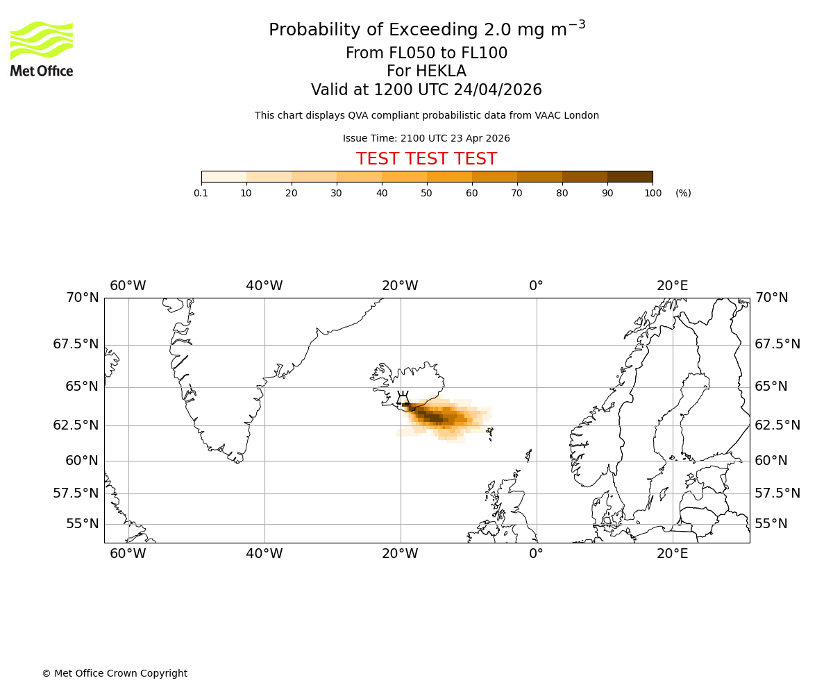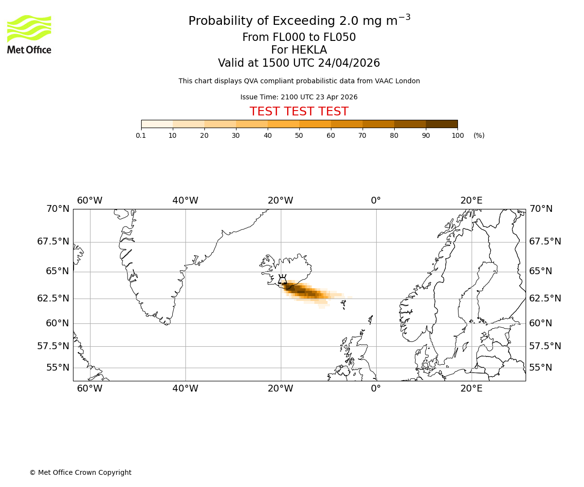 Quantitative Volcanic Ash charts (QVA) are produced in accordance with International Civil Aviation Organization (ICAO) Annex 3 requirements and are provided as well as the London Volcanic Ash Advisory Graphics (VAG) and Advisories (VAA). The lowest QVA threshold (0.2 mg/m³) matches to the areas depicted in the VAA and VAG. Both expected ash concentration and probabilistic forecast information is provided in the chart viewer below for eruptions occurring in the London Volcanic Ash Advisory Centre (VAAC) area of responsibility.