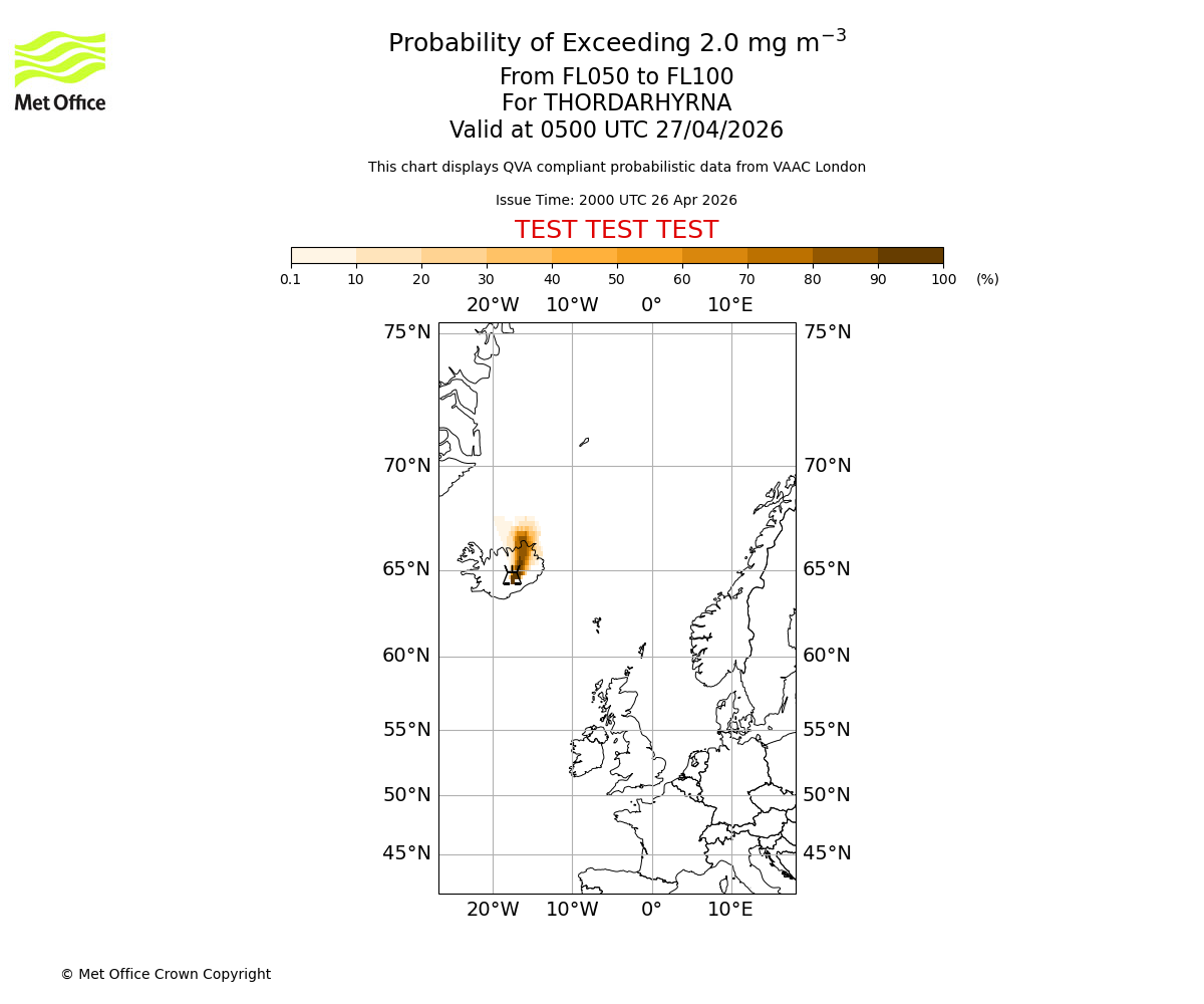 Probability of exceeding 2.0 milligrams per metre cubed. From 000 to 050 for THORDARHYRNA. Valid at 0500 UTC 27/04/2026