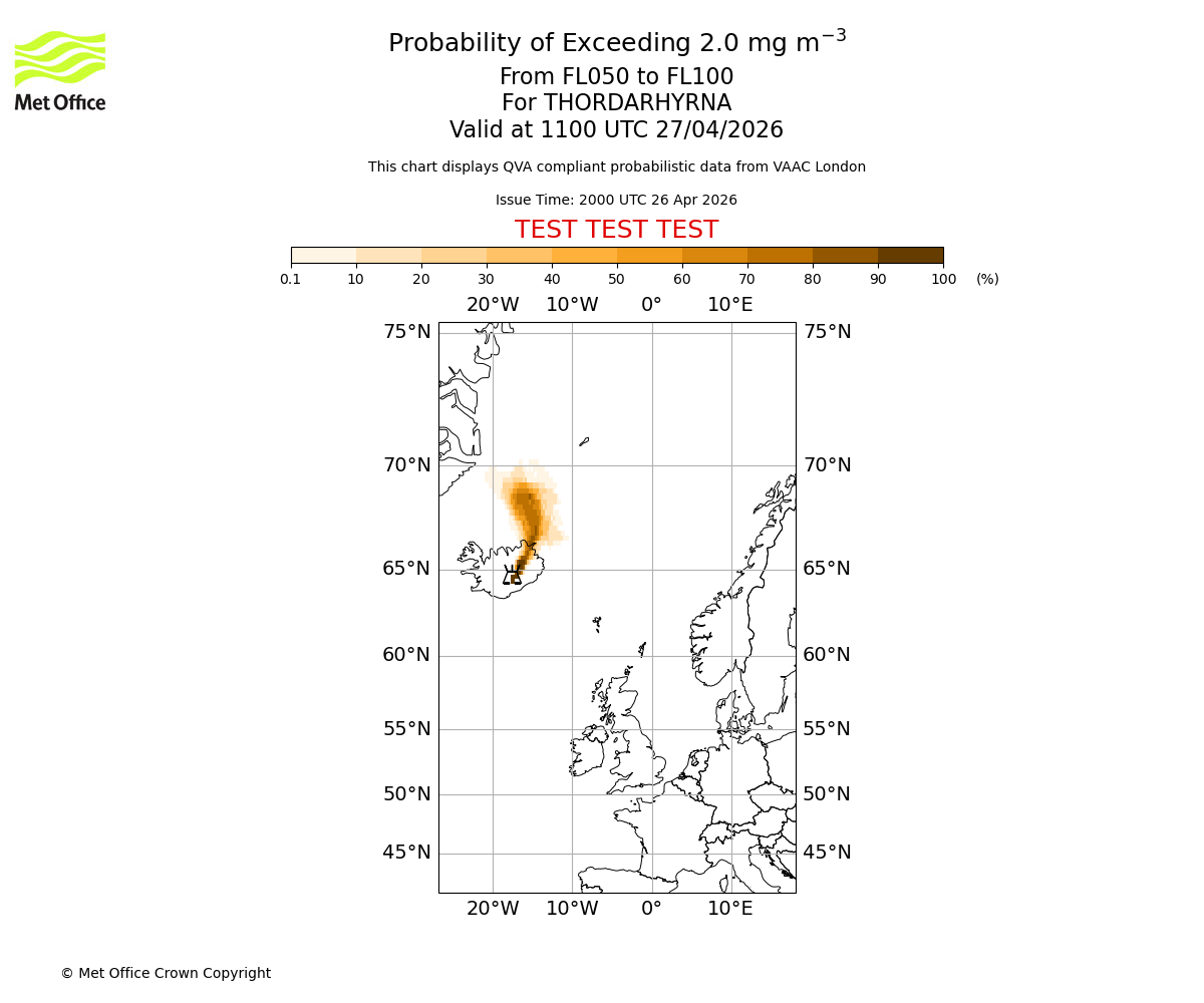 Probability of exceeding 2.0 milligrams per metre cubed. From 000 to 050 for THORDARHYRNA. Valid at 1100 UTC 27/04/2026