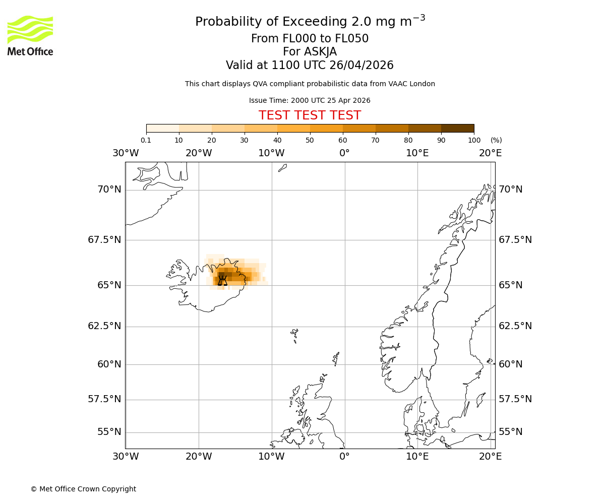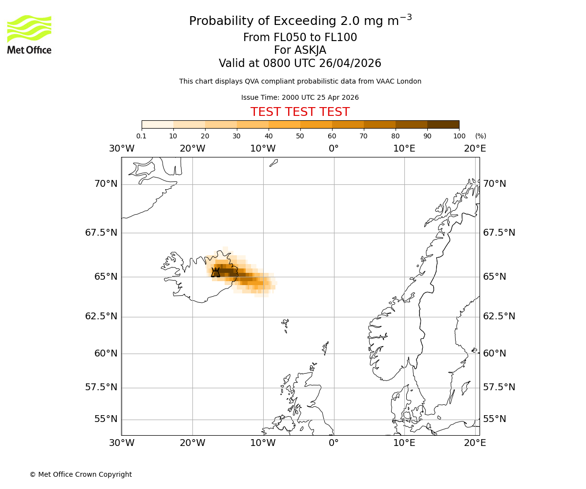 Probability of exceeding 2.0 milligrams per metre cubed. From 000 to 050 for ASKJA. Valid at 0800 UTC 26/04/2026