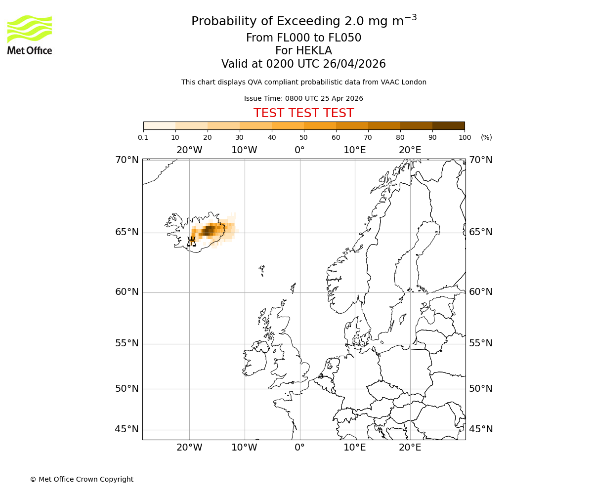 Modelled ash concentration from 000 to 200 for HEKLA. Valid at 0800 UTC 25/04/2026
