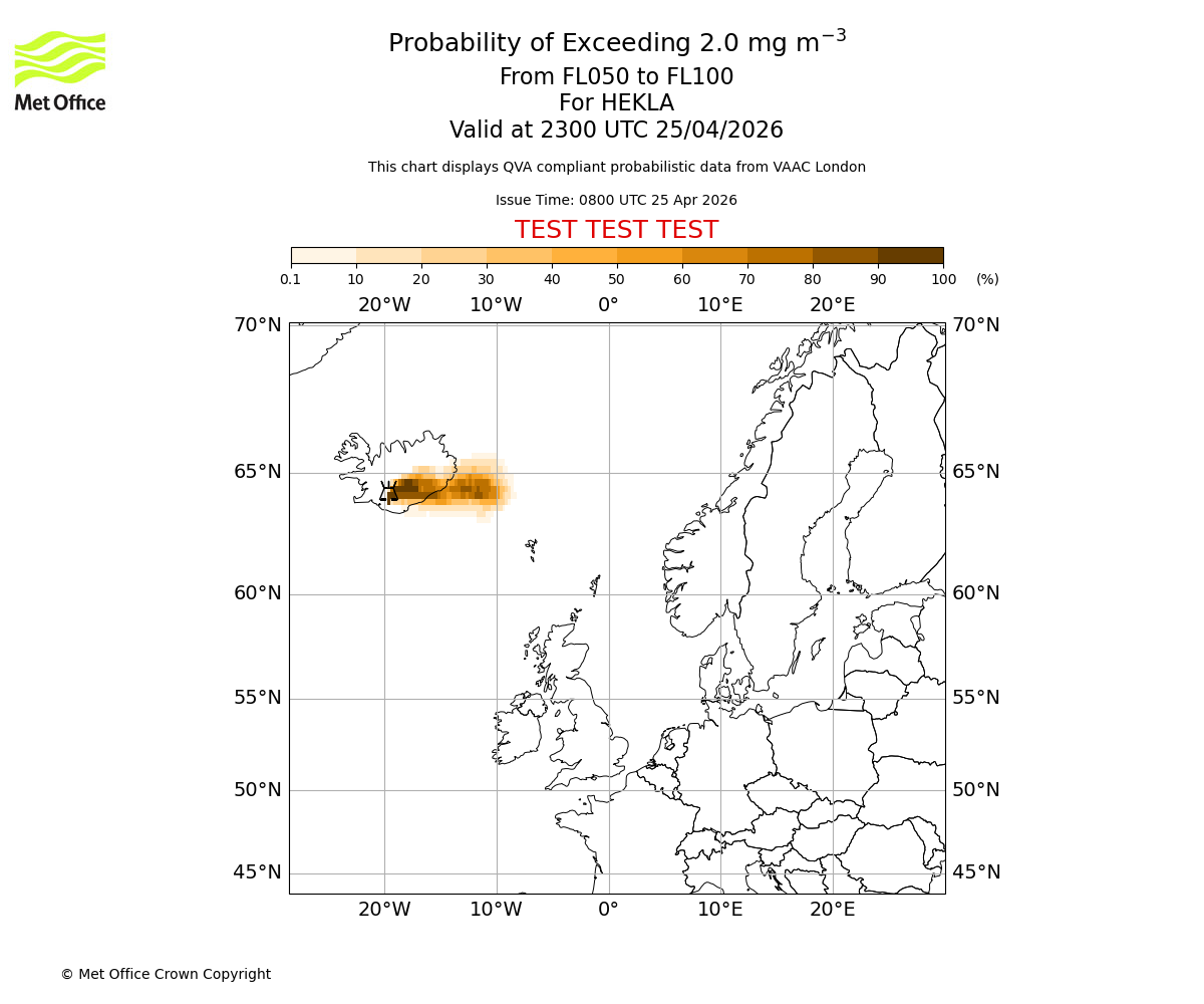 Probability of exceeding 2.0 milligrams per metre cubed. From 000 to 050 for HEKLA. Valid at 2300 UTC 25/04/2026
