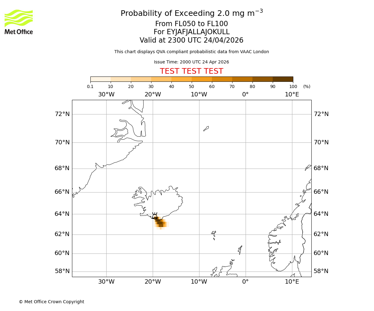 Probability of exceeding 2.0 milligrams per metre cubed. From 000 to 050 for EYJAFJALLAJOKULL. Valid at 2300 UTC 24/04/2026