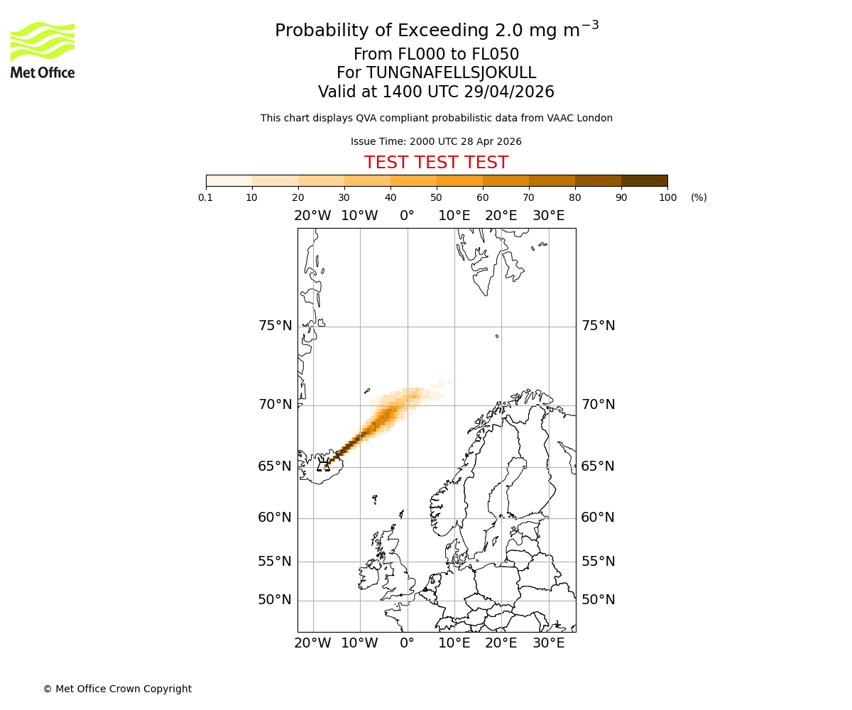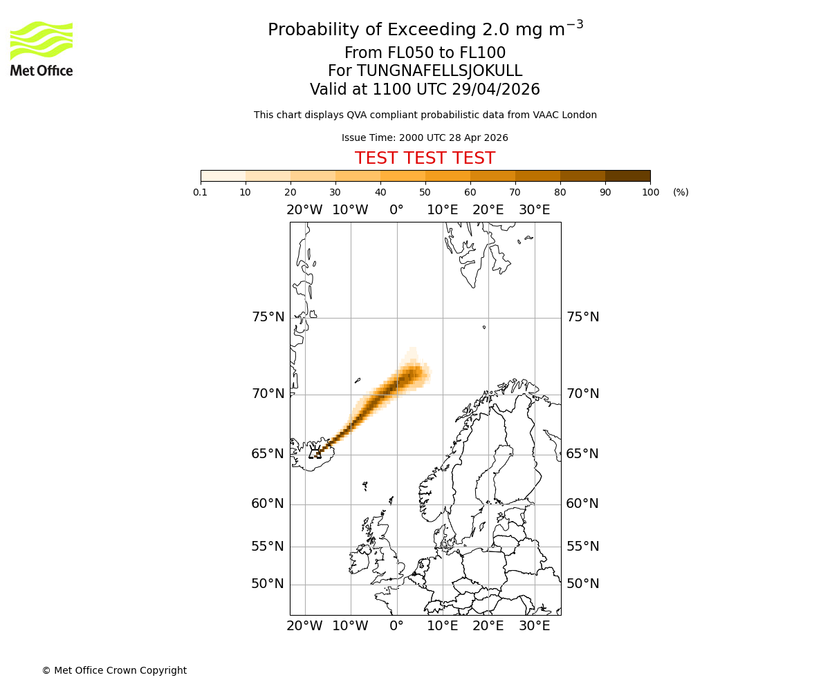 Modelled ash concentration from 000 to 050 for TUNGNAFELLSJOKULL. Valid at 2000 UTC 28/04/2026