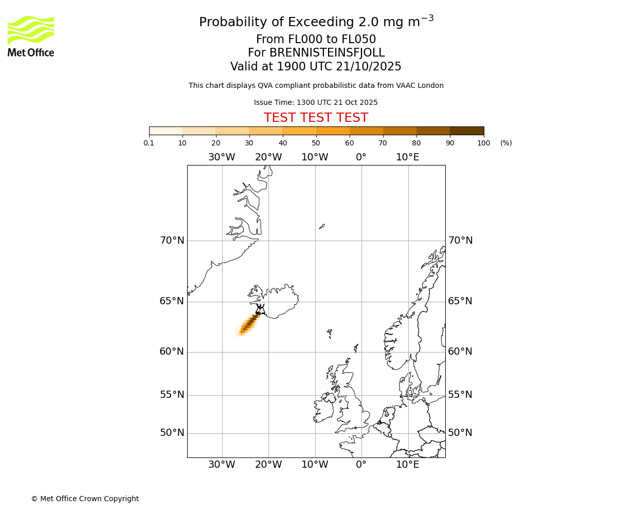 Modelled ash concentration from 000 to 200 for BRENNISTEINSFJOLL. Valid at 1300 UTC 21/10/2025