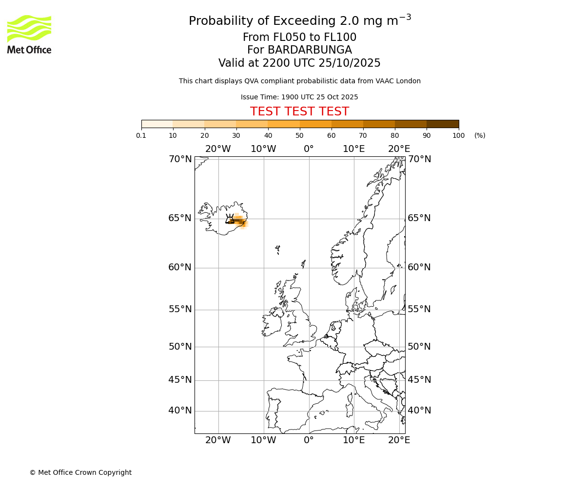 Probability of exceeding 2.0 milligrams per metre cubed. From 000 to 050 for BARDARBUNGA. Valid at 2200 UTC 25/10/2025