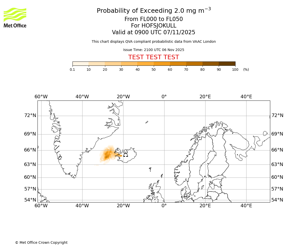 Probability of exceeding 2.0 milligrams per metre cubed. From 000 to 050 for HOFSJOKULL. Valid at 0600 UTC 07/11/2025