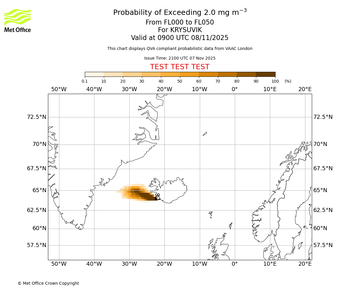 Probability of exceeding 2.0 milligrams per metre cubed. From 000 to 050 for KRYSUVIK. Valid at 0600 UTC 08/11/2025