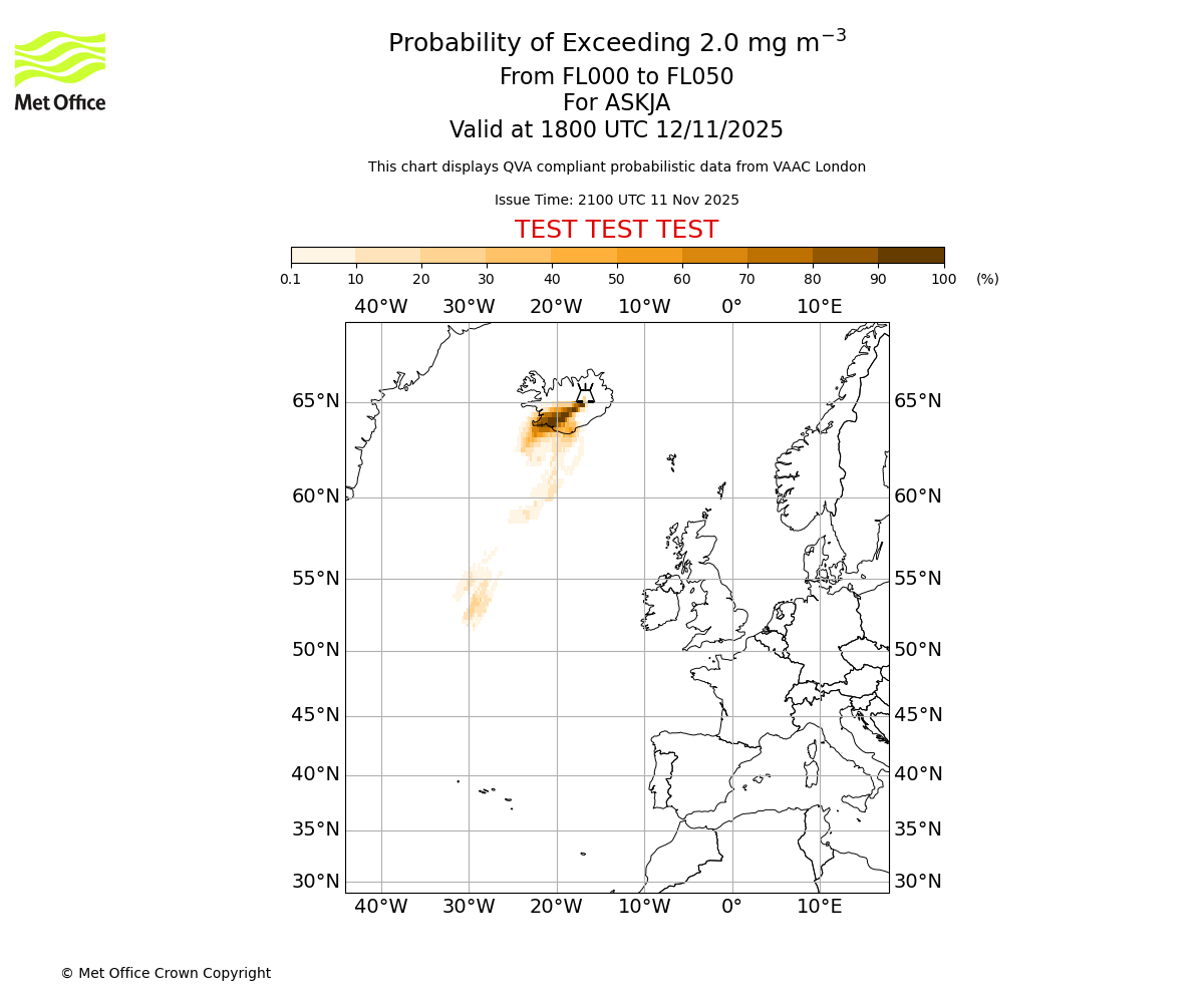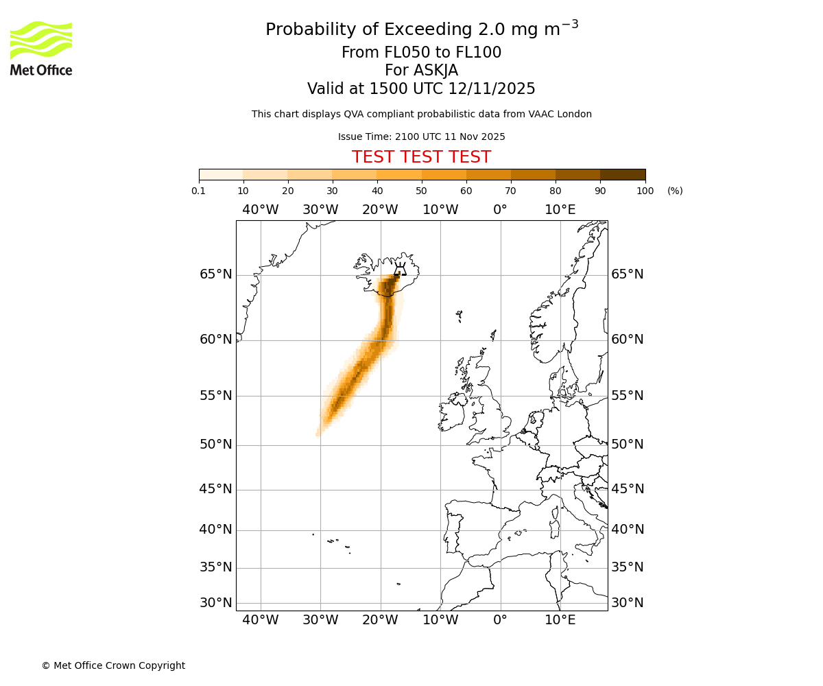 In accordance with ICAO Annex 3, Amendment 82 VAAC London will provide operational QVA forecasts from 27 November 2025 and these will be made available via a VAAC London QVA API information service. These charts are currently provided for test and evaluation purposes (not for operational use) until the introduction of the operational service.