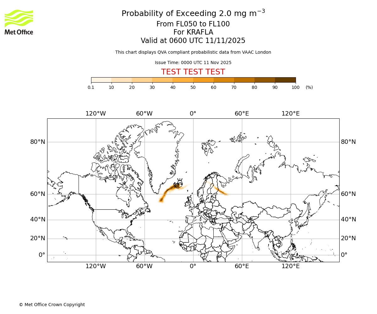 In accordance with ICAO Annex 3, Amendment 82 VAAC London will provide operational QVA forecasts from 27 November 2025 and these will be made available via a VAAC London QVA API information service. These charts are currently provided for test and evaluation purposes (not for operational use) until the introduction of the operational service.