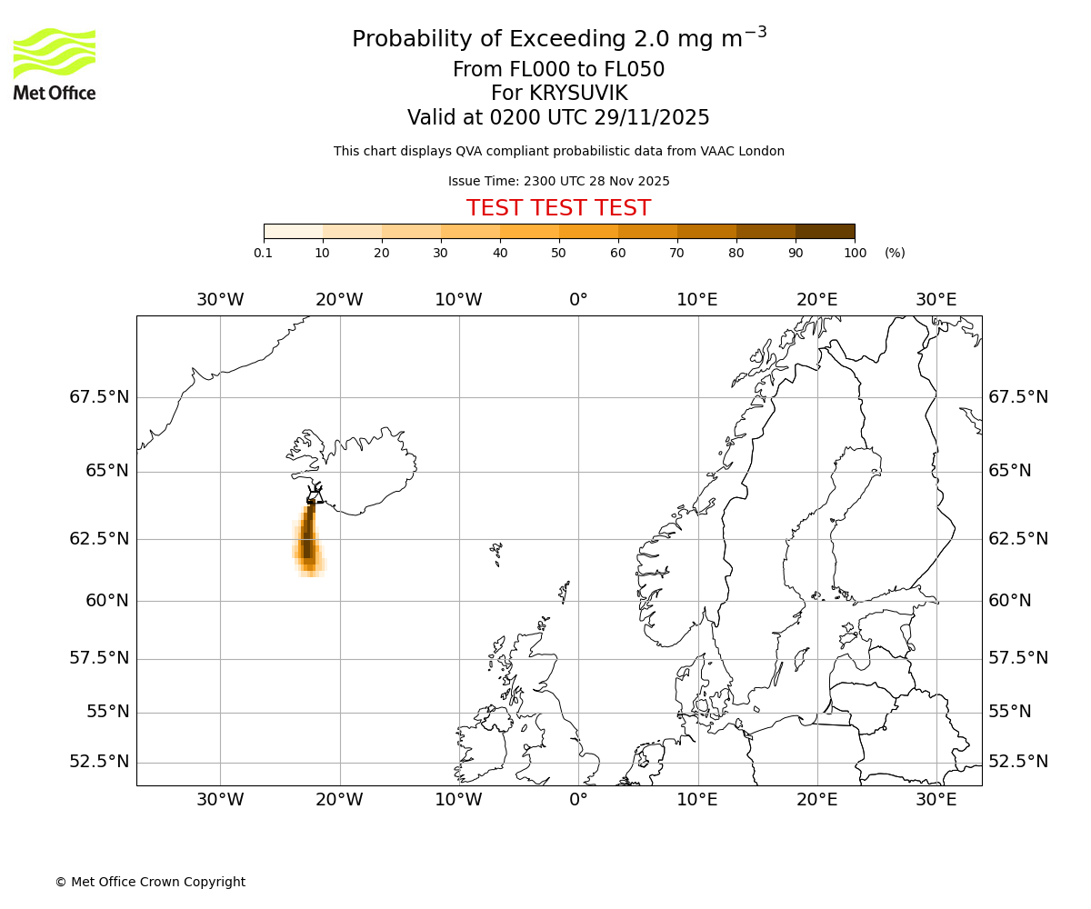 Probability of exceeding 2.0 milligrams per metre cubed. From 000 to 050 for KRYSUVIK. Valid at 2300 UTC 28/11/2025