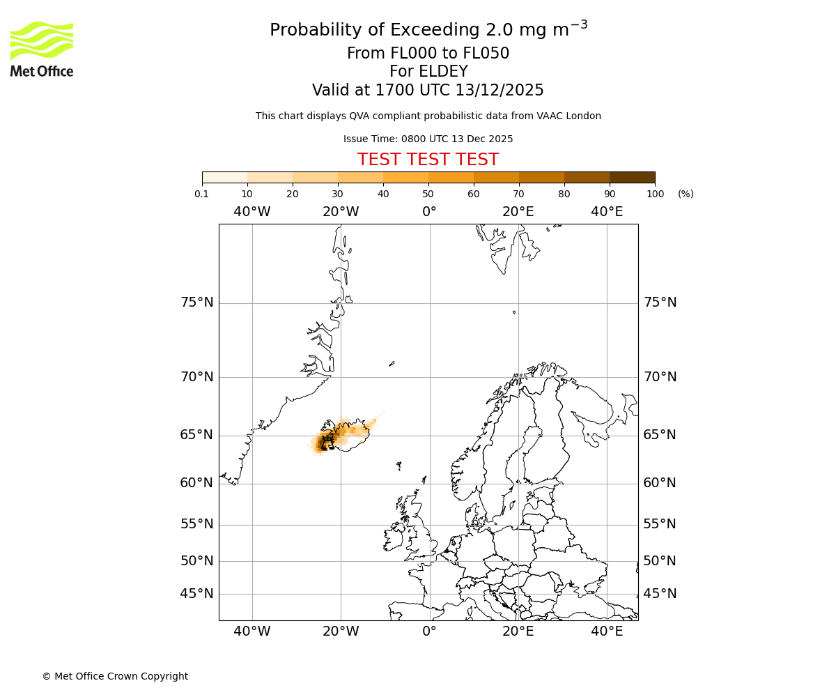 Modelled ash concentration from 000 to 050 for ELDEY. Valid at 0800 UTC 13/12/2025