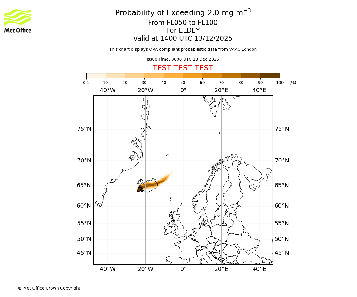 Modelled ash concentration from 000 to 200 for ELDEY. Valid at 0800 UTC 13/12/2025