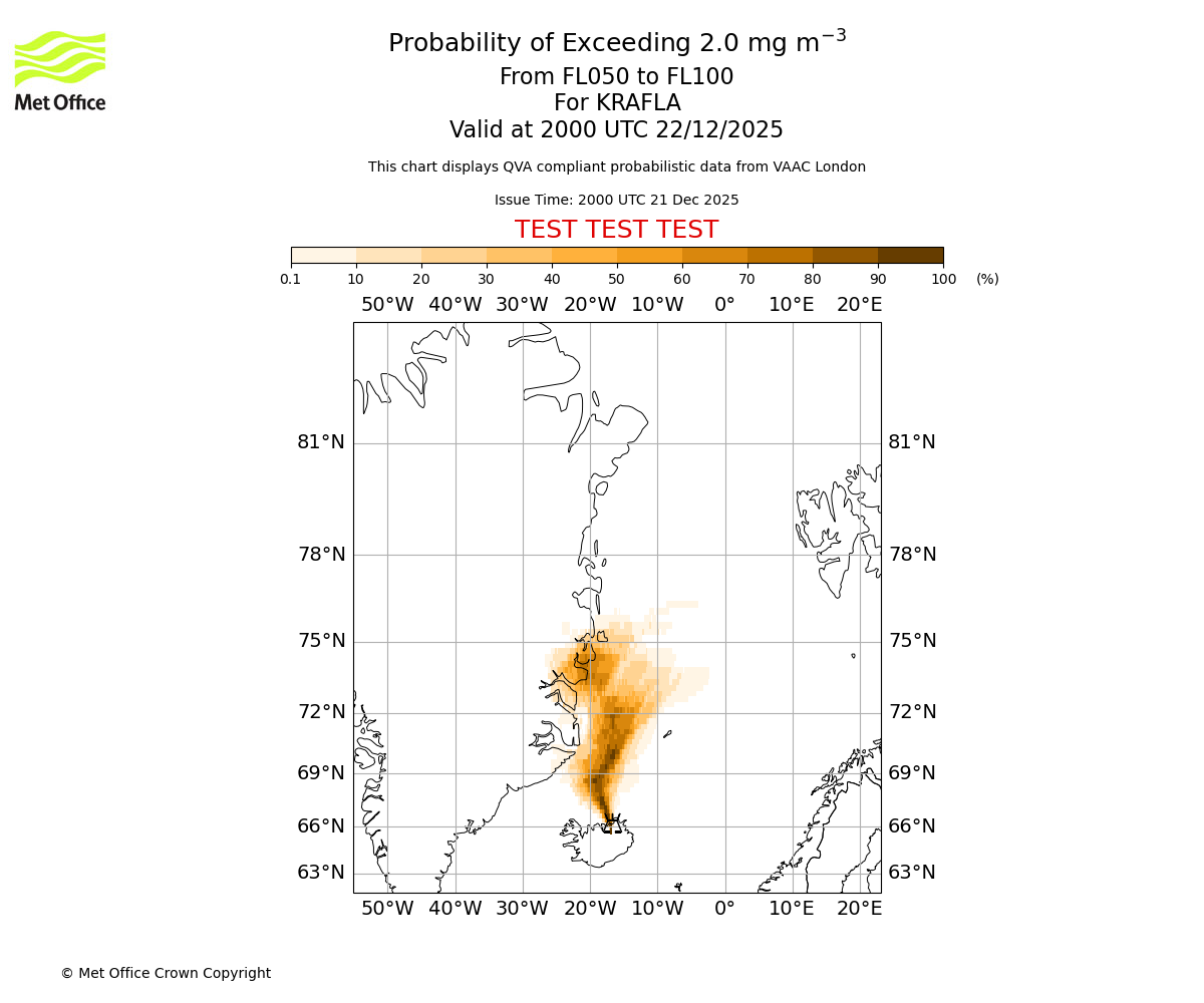 Probability of exceeding 2.0 milligrams per metre cubed. From 000 to 050 for KRAFLA. Valid at 2000 UTC 22/12/2025