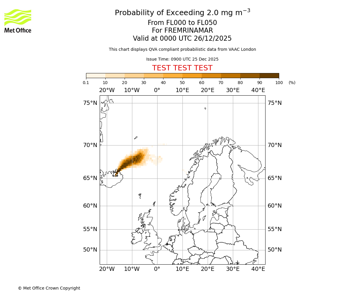 Modelled ash concentration from 000 to 050 for FREMRINAMAR. Valid at 0900 UTC 25/12/2025