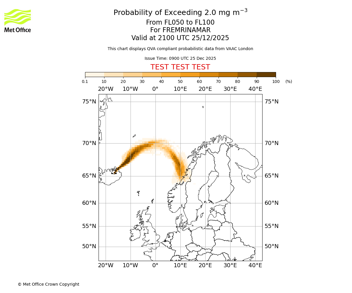 Modelled ash concentration from 000 to 200 for FREMRINAMAR. Valid at 0900 UTC 25/12/2025