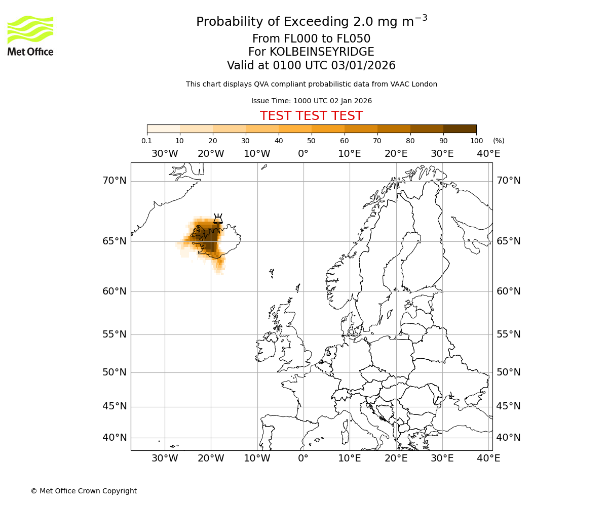 Modelled ash concentration from 000 to 200 for KOLBEINSEYRIDGE. Valid at 1000 UTC 02/01/2026