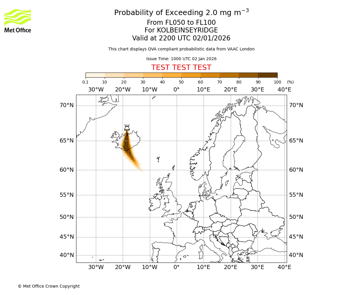 Probability of exceeding 2.0 milligrams per metre cubed. From 000 to 050 for KOLBEINSEYRIDGE. Valid at 2200 UTC 02/01/2026