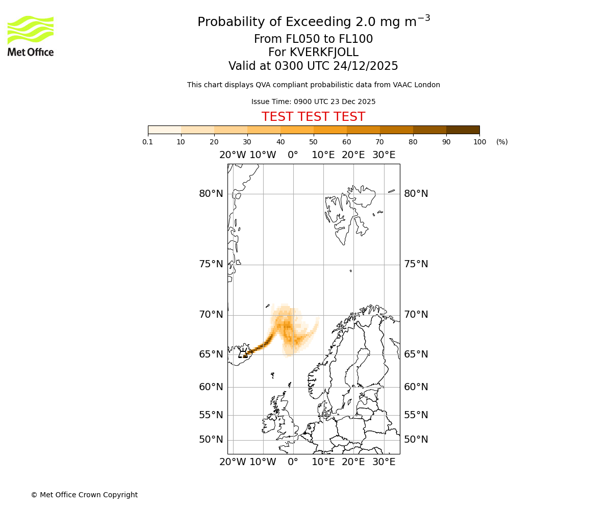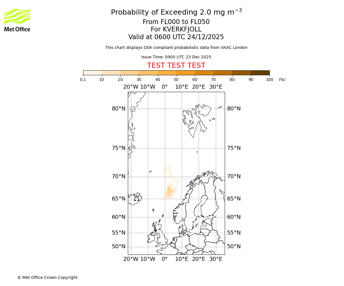 Probability of exceeding 2.0 milligrams per metre cubed. From 000 to 050 for KVERKFJOLL. Valid at 0300 UTC 24/12/2025